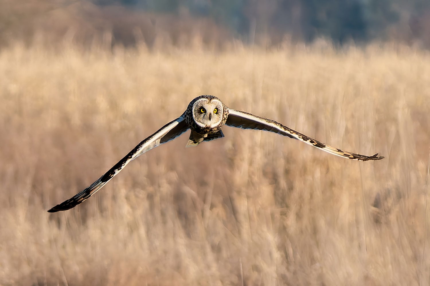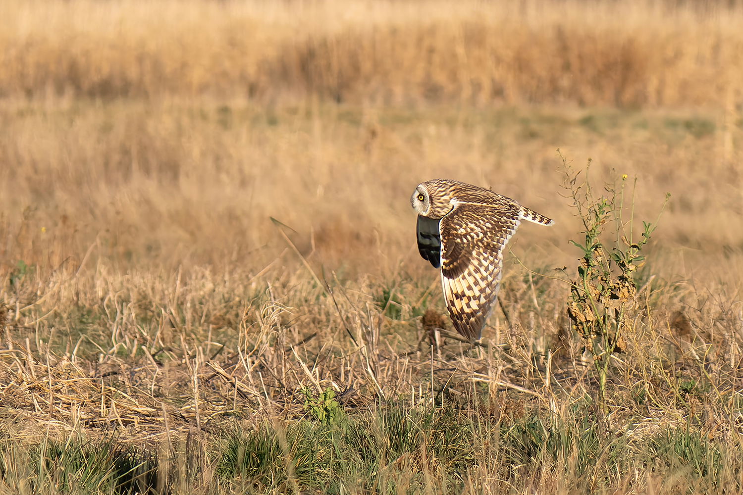 This is a really tough shot to get. Kudos for getting it! The foreground is sharper and the owl is slightly out of focus, but I think it is what it is. You captured a moment in time that maybe can’t be improved a whole lot. Some shots are just like that. Of course you can always try, but you may spend a lot of time and for not much reward. The photo as a whole tells the story for me - an owl hunting in its beautiful grassland territory.