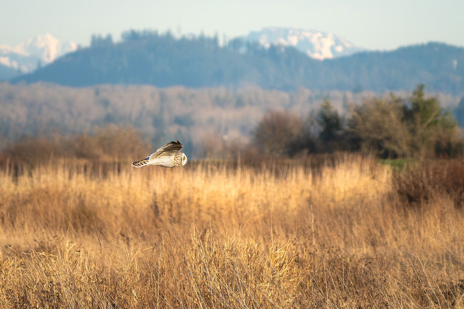 Hi Stephen, really nice environmental capture of this owl on the hunt scene. Love the various layers you show here from the grasses to the mountain. Well done. The bird is well placed in the frame. I could see darkening the highlights and mid tones a bit. Nice image.