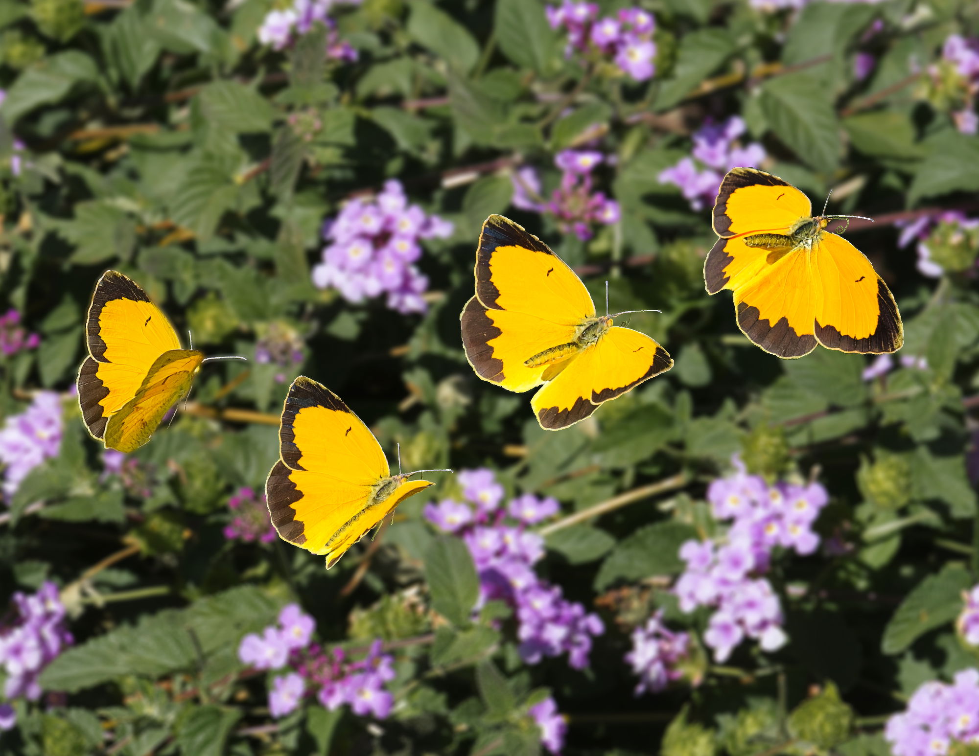This image is my attempt to tell a story of motion. It presents four separate images of a single Sleepy Orange traversing the field of view. The images were captured every 0.008 seconds. These images were then dropped into a photograph of the background, with a technique known as compositing. I’m a rookie at this, and I’m sure a practiced eye would find opportunities for improvement. Still, I’m pleased that a patient person with a modern camera can tell the viewer what a speeding butterfly was doing from one edge of the frame to the other.