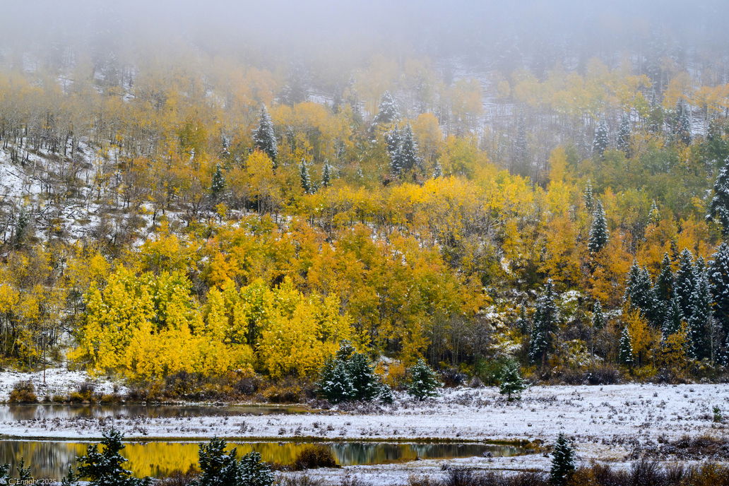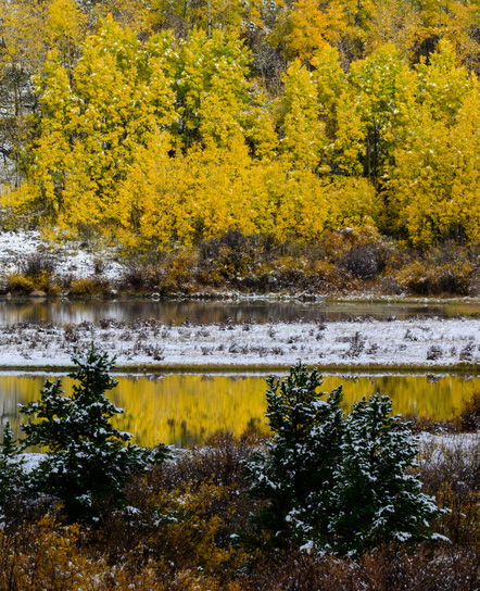 You captured some wonderful autumn color with the aspens and I like the transition of the seasons with the snow. I am also enjoying that colorful autumn reflection in the water as well. I think this is one of those scenes where to much information was captured. For my tastes all of the good stuff is towards the center of the frame with the FG evergreens, the reflection and topped off with those beautiful aspens. Have you considered a crop from the right and left sides to emphasize those elements? I hope you do not mind, but here is a rework with what I was thinking. Just my opinion of course as this may not be your vision for this image. I hope to see some more posts as well as your comments on other photographer’s work in the future.