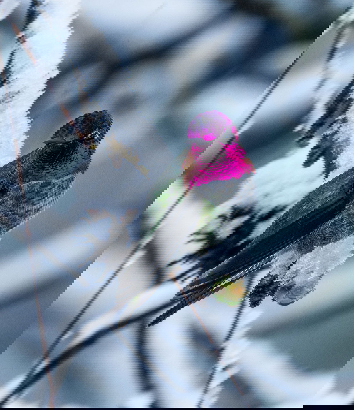I woke up this morning with an unexpected inch of snow on the ground. I couldn’t wait to jump up and see what bird possibilities I might catch. For some reason we are having a huge influx of hummingbirds to our feeder ( I estimate that at least 20 were on, or wanting to be on our feeder while ago!). I tiptoed out onto our deck to try for some perched birds in our nearby liquid amber tree which is a favorite haunt for the hummers to sit, and guard the feeder. Sure enough I had lots of opportunities. It was a challenge though. What with the frenzy going on at the feeder, the ones perching were hardly there more than a second or two. I did manage to get some shots even thought light was still very dim still.