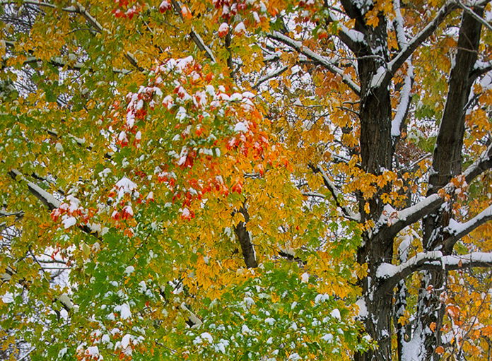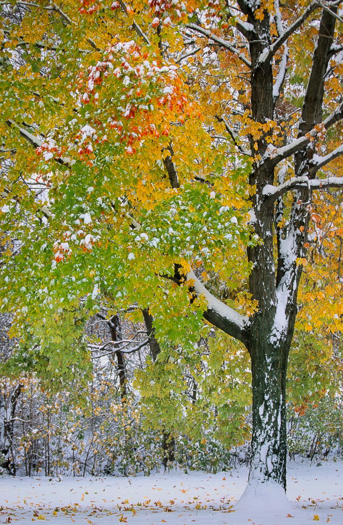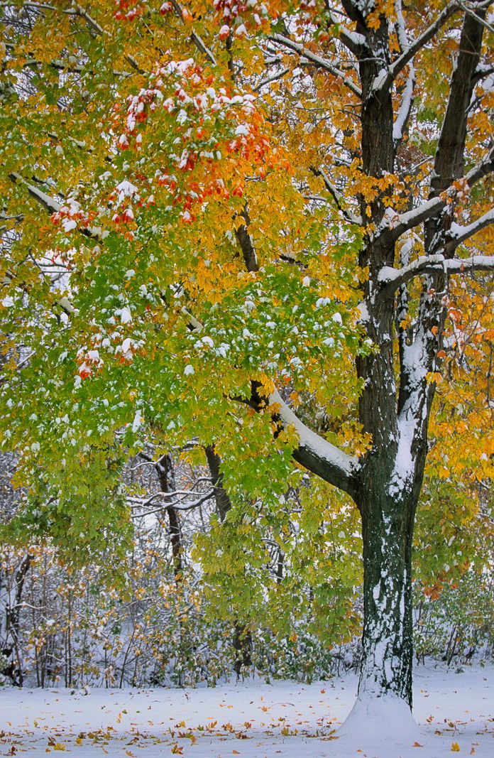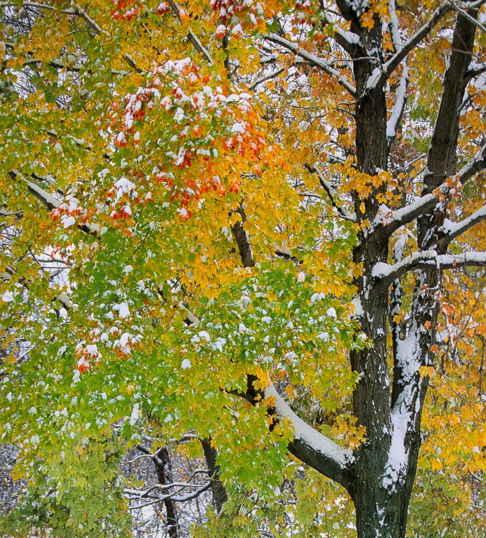 Autumn foliage taken the morning after an early snowfall in Massachusetts. This was taken during late October in a year when the trees turned later than normal and peak color was still around for the first snow. These “snowliage” conditions only happen once every 5 or 6 years where I live in Massachusetts, so I felt very lucky to get this while the trees were still in such great shape.