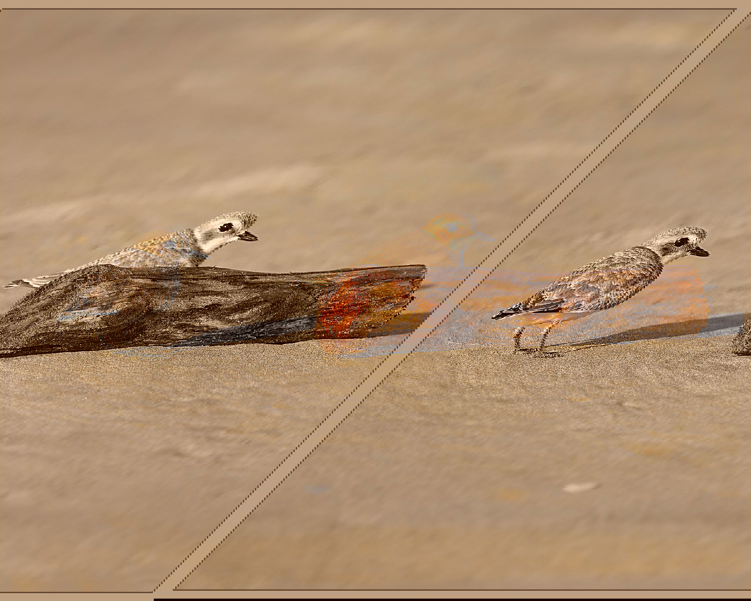 A beautiful scene you’ve captured here Allen, I’m enjoying the detail and agree about the driftwood being included, which, along with the faint sand patterns, adds interest to the image. A little cropping may enhance the birds further.