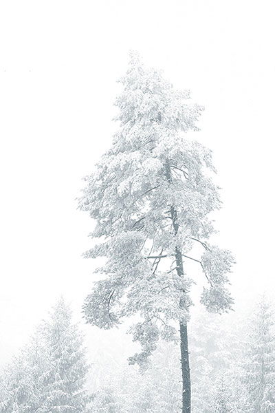 At the beginning of February this year, I spent several days hiking with my wife in Forest Quarter, the north-western part of the Austrian state of Lower Austria. This region is well know for rough weather conditions, especially also longer periods of dens fog. In winter, this may lead to persisting hoar frost. This month it came together with delicate snowfall. Reaching a silvan glade in a dense forest, this solitary pine exposed to the wintry weather draw my attention.