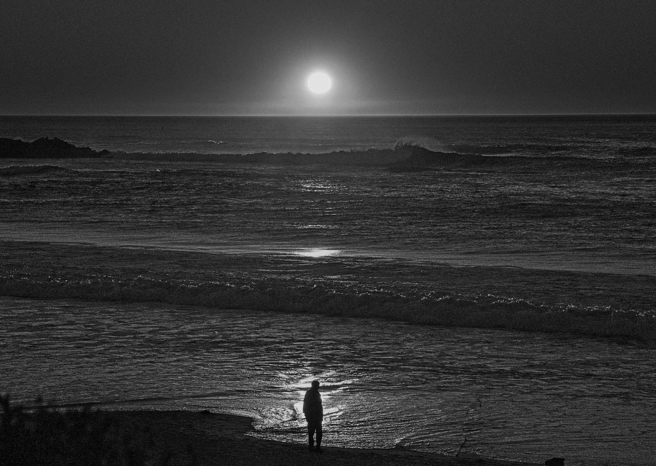 This is a photo of a man walking on the beach in Carmel, California, while the sun is setting into the Pacific Ocean. There is also a little dog in the photo (lower right), that is not very visible. I initially processed this photo in color but am try to do more monochrome so I converted it. I like the way the light from the sun hits the ocean and the way the man is lined up with the light spots in the ocean and the sun.