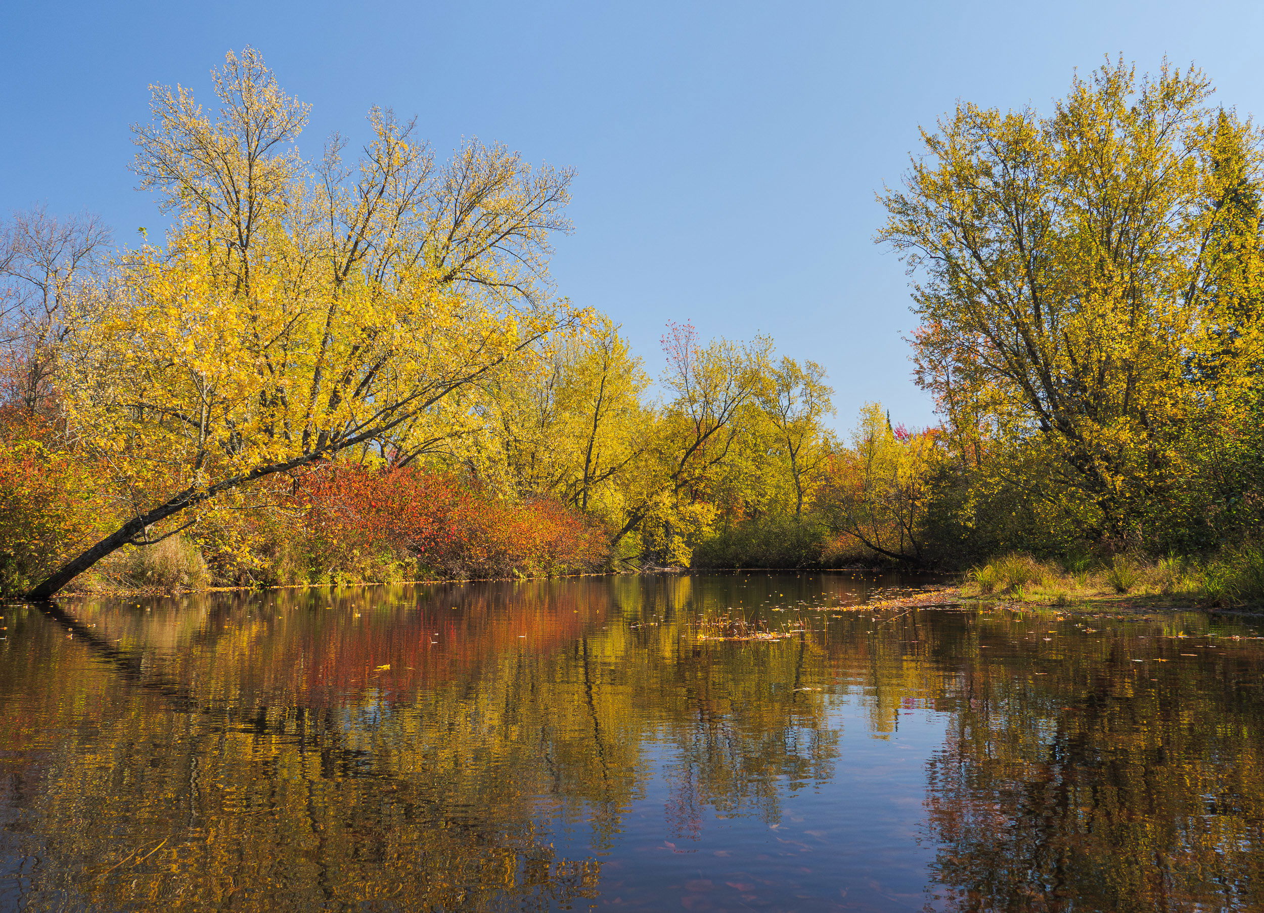 Kris: I like this as is but a simple crop makes this more impactful for me. By filling more of the frame with the fall colors the sky becomes more of a complement and less of a competition for my attention. For me the clear water is a plus and I like being able to see the leaves. I’m still jealous of your kayak experiences. Keep after it. >=))>