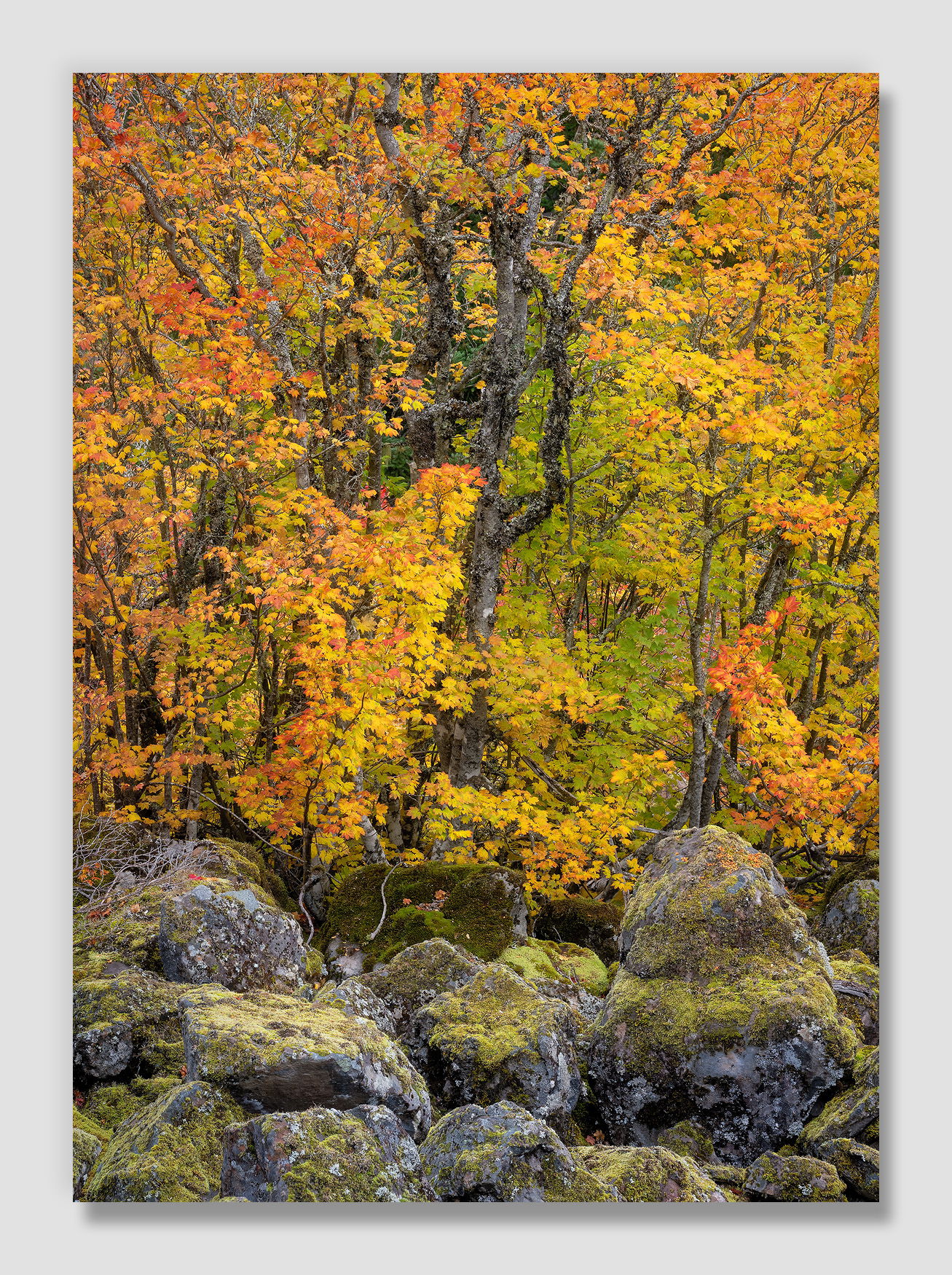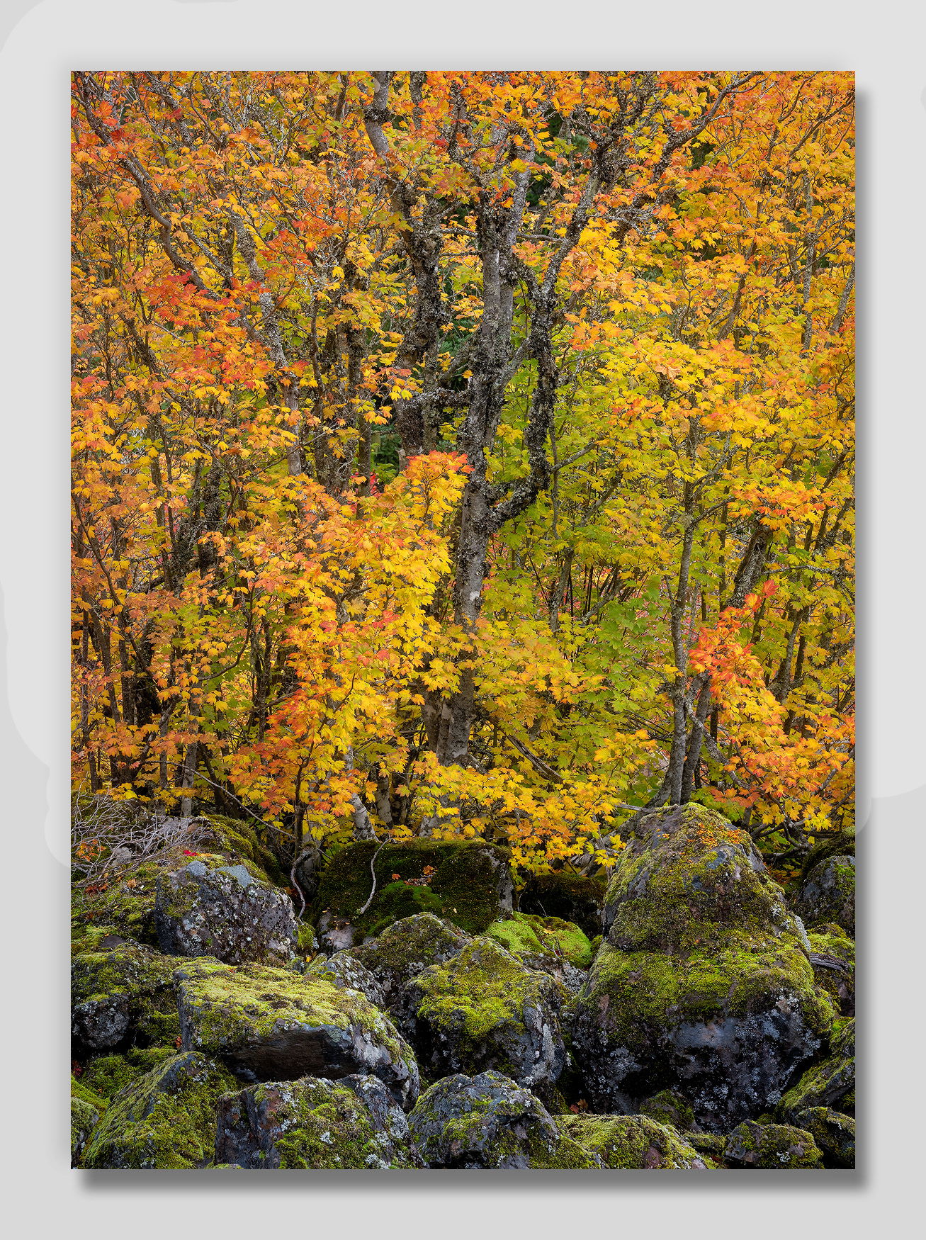 This is beautiful. The green tones in the rocks is linked nicely with the colors peaking through in the BG behind the maples. I like the intricate details in moss covered rocks coupled with the intricate detail of the leaves in the trees, as well as the details in exposed trunks. The muted colors of the rocks make a great foundation to the more colorful leaves. Its a really nice photograph.