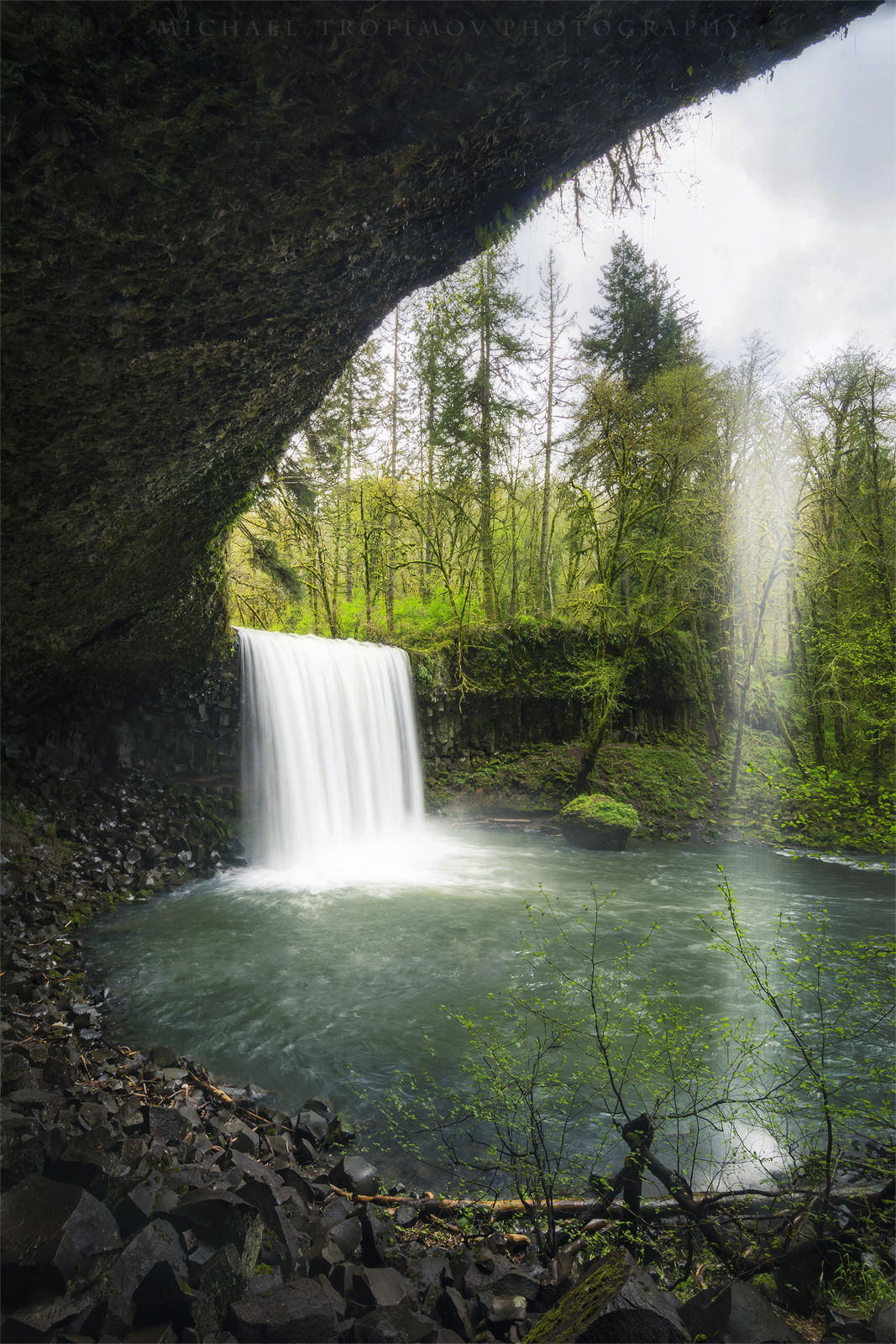Michael, your use of the secondary falls adds a touch of intrigue/challenge as it makes the viewer stop and think about what is going on. The main falls is a beauty with all the spring greens looking very good. Nice job holding tones in the underside of the overhang.