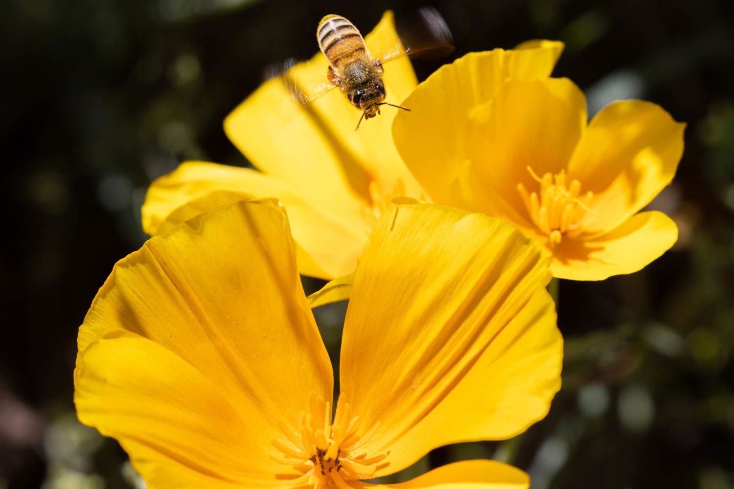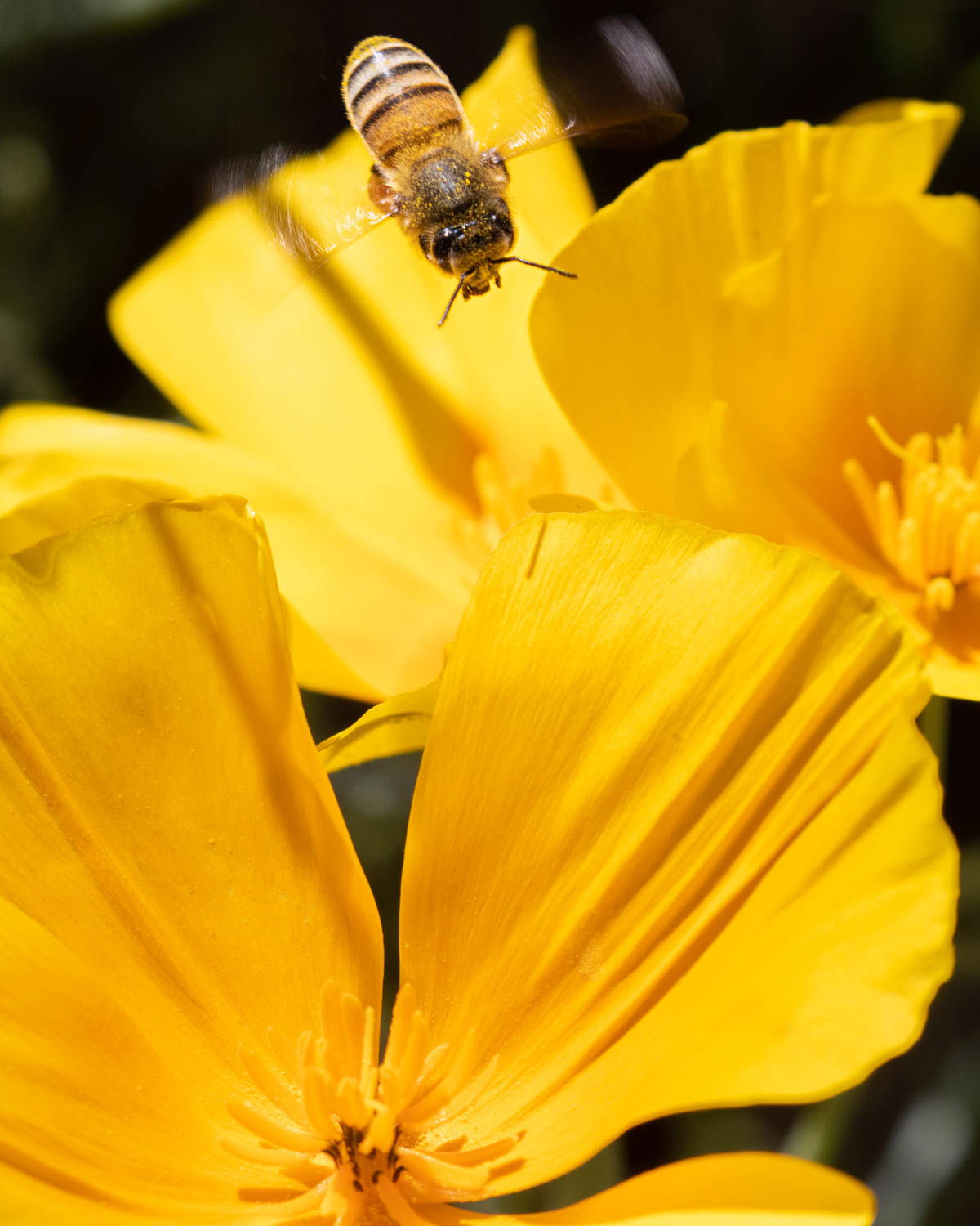 I was hoping to catch this bee a little closer to the bottom flower but sometimes it does not work that way. I was not shooting high speed shooting. I like the bee where there is enough focus but also some movement effect. I was wondering how to crop this and if anything else could be done. There were a lot of bees around the spring poppies so I can easily go back.