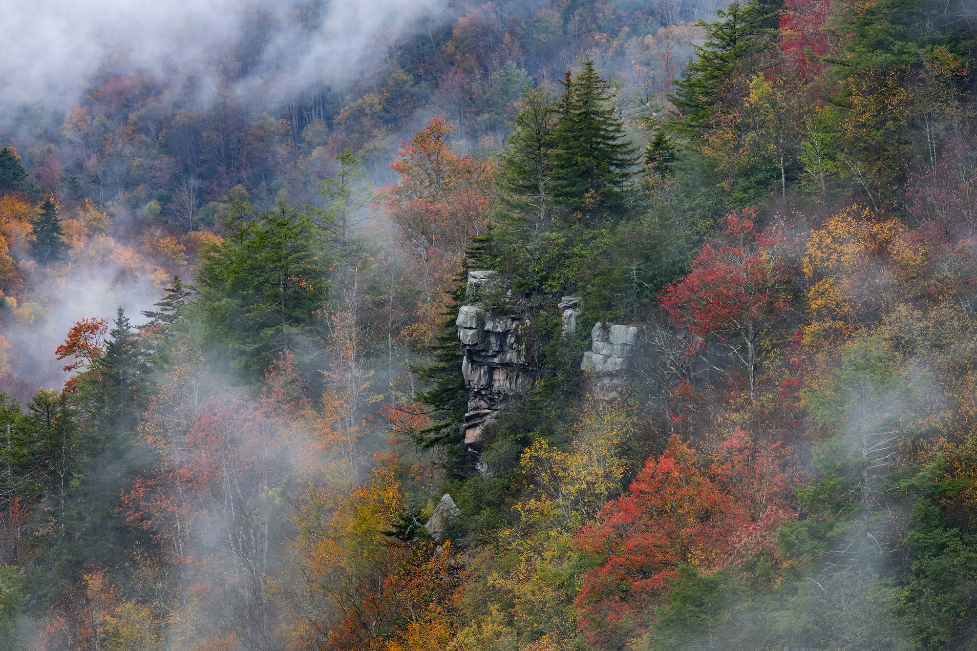This image is from a recent trip my brother and I made to Blackwater Falls SP in WV. We timed the trip for a rainy day and we were not disappointed as quite often on rainy days the mist and fog swirls in and out of Blackwater Canyon. It was a little nerve wracking capturing this image as we were standing on a rock outcropping a couple of feet from the edge of the canyon in wet slippery conditions during the rain. The things we do. The wind was blowing the rain into our faces and on the front of the lens element and we had to press the shutter and then wipe the lens after every capture. Unfortunately this file was a little soft as I did not do a good enough job of drying the rain from the front of the lens so Mike ran it through a program on his computer to sharpen it up a little.