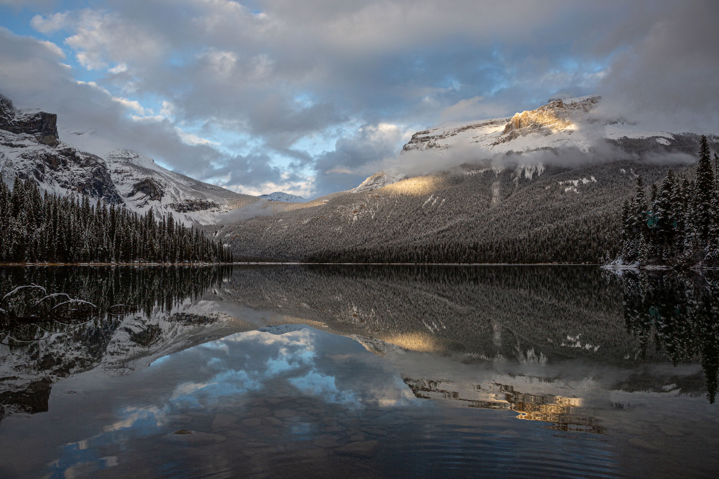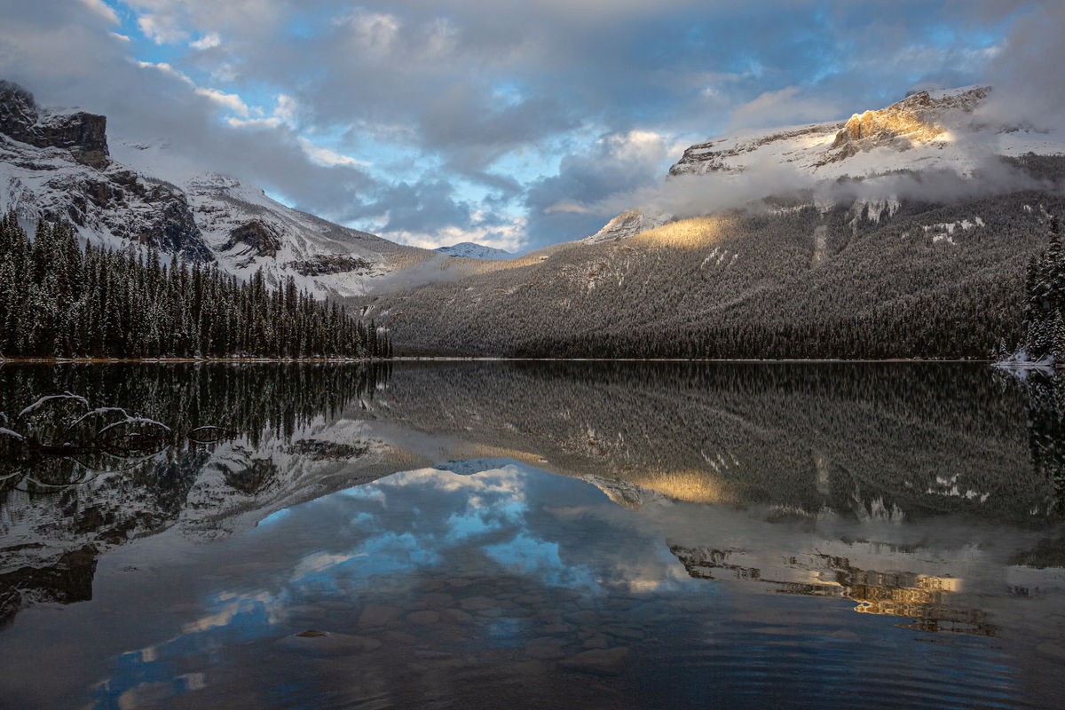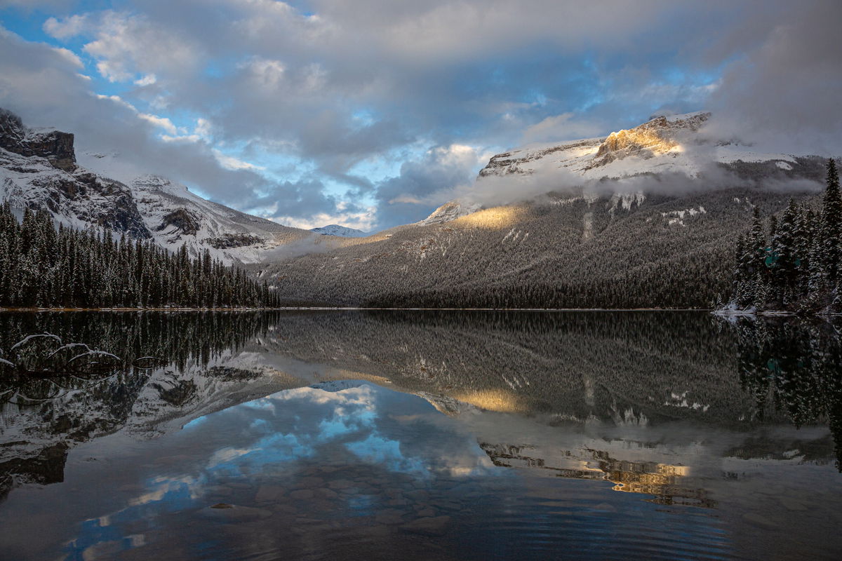 I shot this image at Emerald Lake in Yoho National Park (BC Canada) while on a workshop with Paul Zizka and Stacia Schmidt. I was drawn to the spot of light in an otherwise still somewhat stormy afternoon sky. The clarity of the reflection in the water was stunning,emphasized textto get beyond some foreground I didn’t love, I had to step in. I decided to shoot the ripples as well.