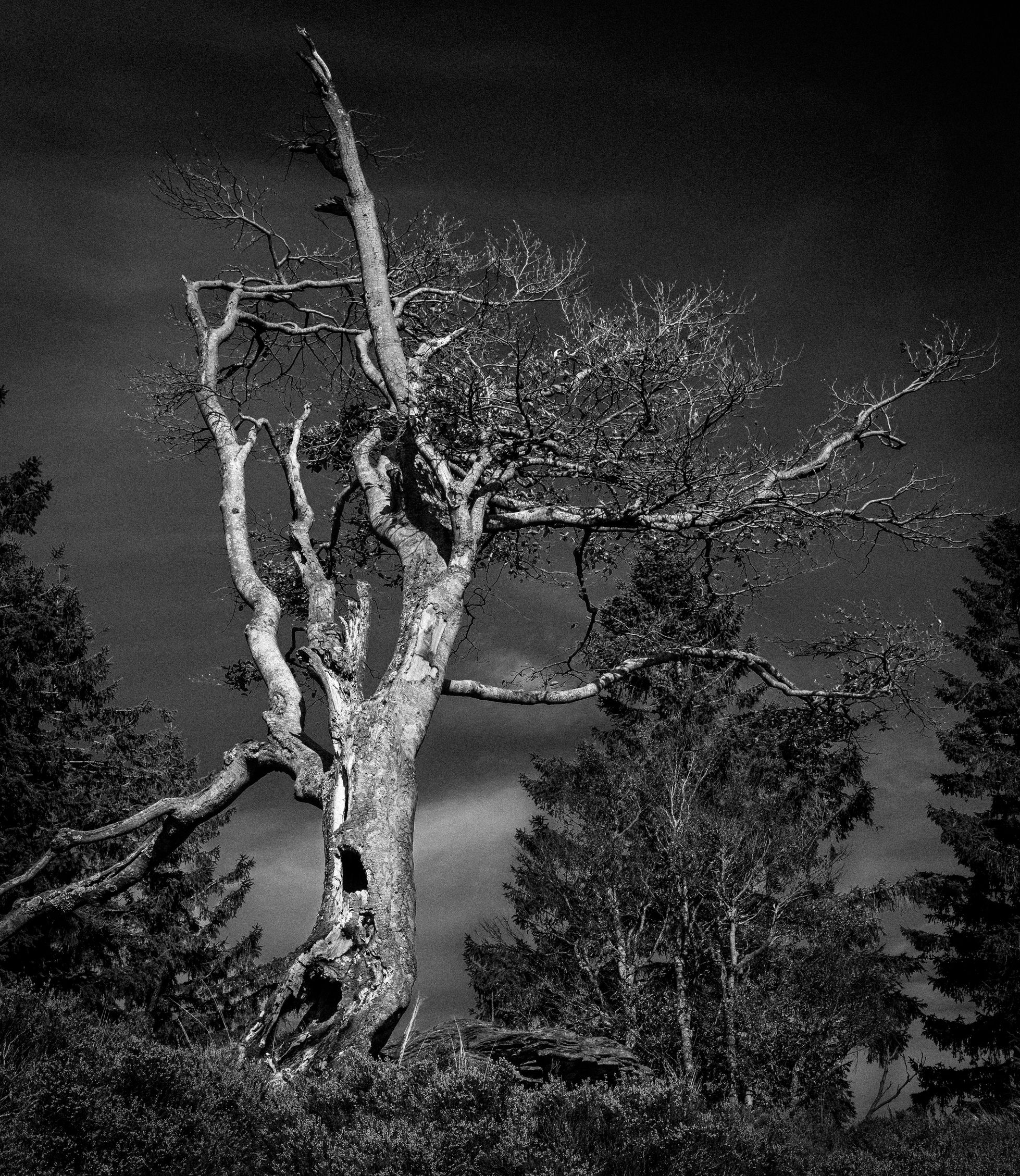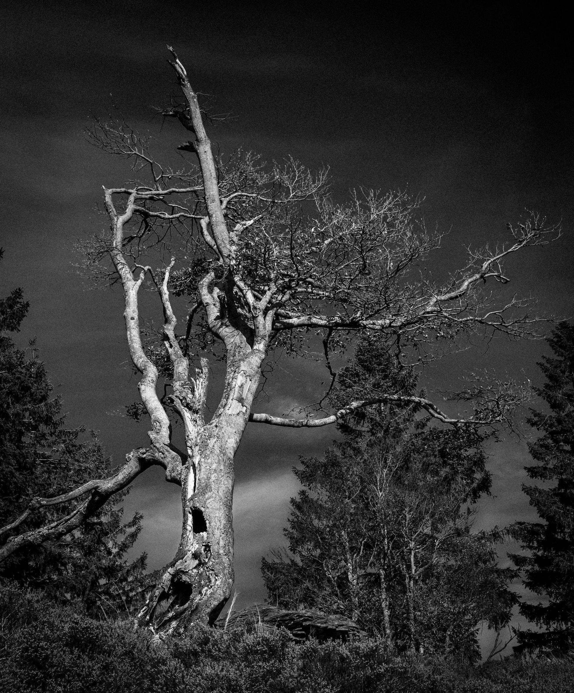 I like the theme of your photo and what you were aiming for. The composition works and the dark BG makes the tree stand out more. B&W works well here. I would be tempted to dodge the tree even a little more. JMHO. The following is just my personal preference and nothing more. Some people like grain. To be totally honest, I never liked grain in a photo, even back in the analog film age. That’s why my film of choice was always Velvia 50. That’s not a criticism of the photo.