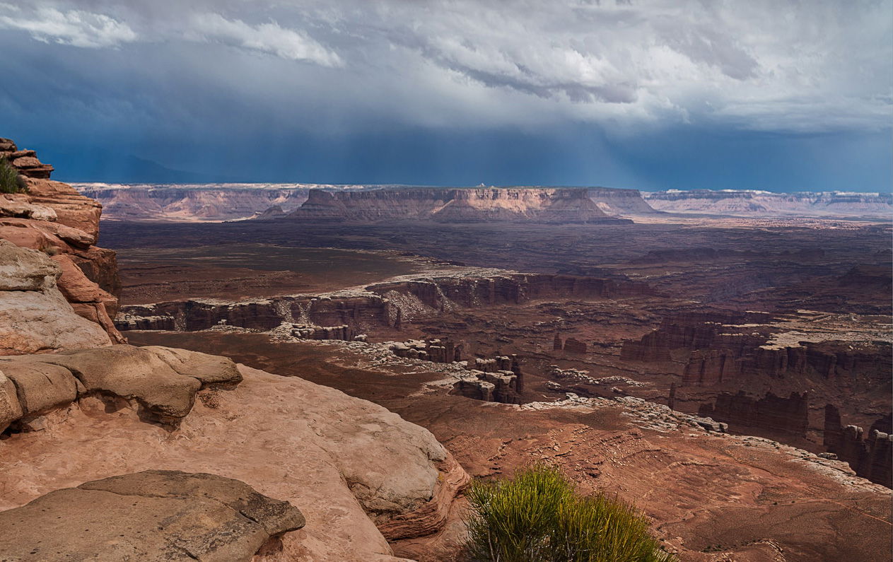 A series of storms moved through Moab late last week and I took the opportunity to visit Canyonlands with high hopes of witnessing some dramatic conditions. As you can see by this photo, I succeeded. This is at Grand View Point. I’d already been out to this spot once and got chased off by an incoming storm dropping lightning, pea sized hail and heavy rain. Literally sprinted back to my truck to wait it out. Not visible in this photo are dozens of potholes full of water that were bone dry thirty minutes earlier. When the rain let up enough I came back to this spot and started shooting photos in ever-changing conditions. The first few photos had only light on the background cliffs but I stayed put and crossed my fingers that a few more rays of light might break through clouds and illuminate the foreground and mid-ground. That never happened. This is actually a time-blended composite of two images; one for the little spot of light on the canyon just below the mormon tea and a second image for everything else. I really wanted some light - even just a small spotlight - on the flat expanse of land between the end of the canyon and the sunlit background cliffs but alas, it wasn’t meant to be.