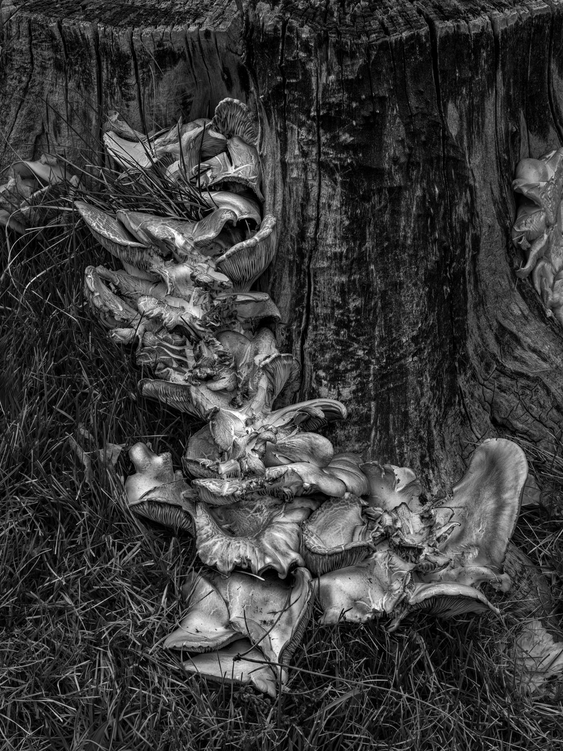The tones on the mushrooms are just wonderful and attract all the attention. I like how they appear to be spilling out of the stump like a waterfall. The other mass of mushrooms on the right do grab my eye and I wish they were not there.