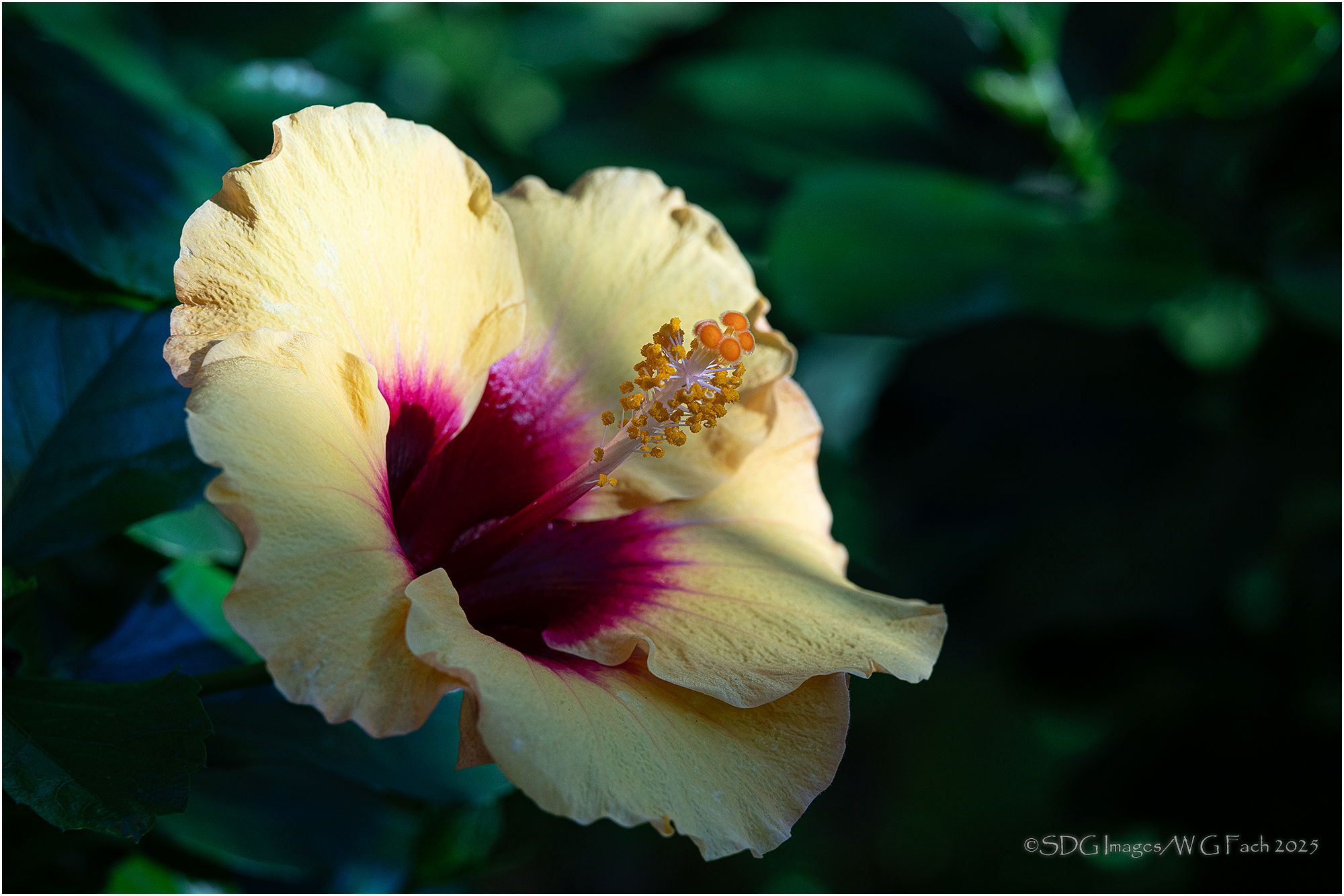 Had some fun with this hibiscus a few mornings ago as the light coming through the trees kept changing. I had some with the entire flower illuminated but thought the dappled light was a lot more interesting. >=))>