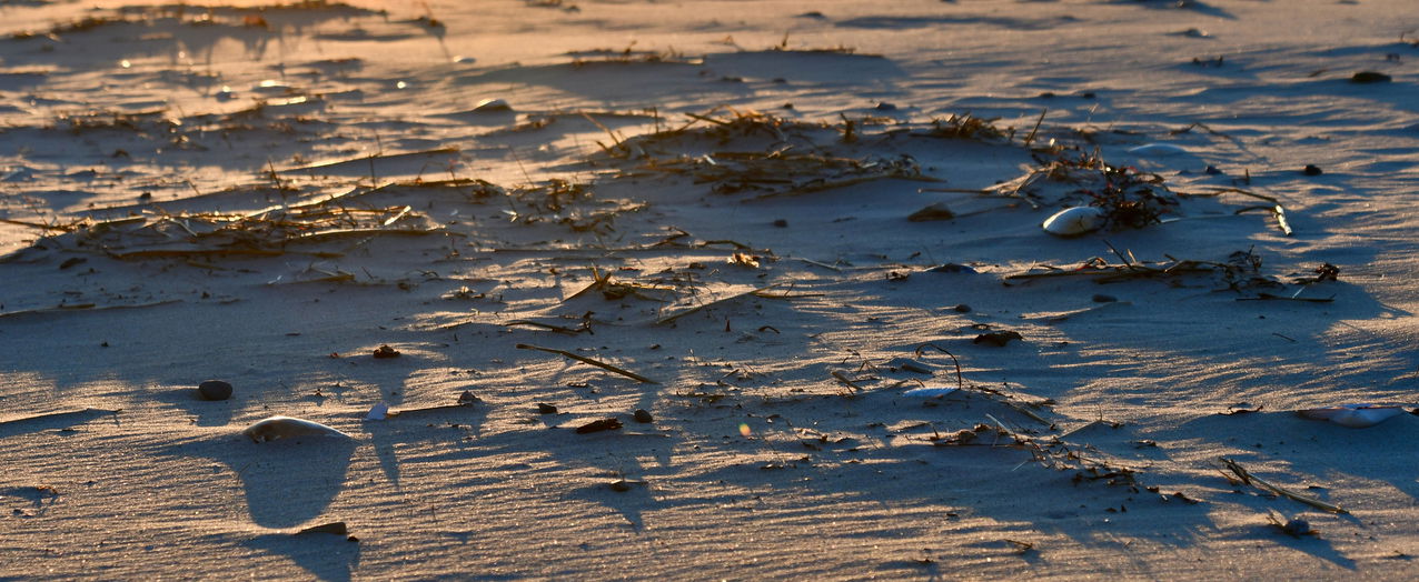 Elizabeth, the sun’s low angle does a good job of showing off the details of the beach with it’s mix of sand, stone, shells, seaweed and debris. I think you have a couple of possible crops. Just the skyline, leaves the sunstreak, which helps tell about the time of day and location. All of the water, limiting the story to only the textures of the beach.