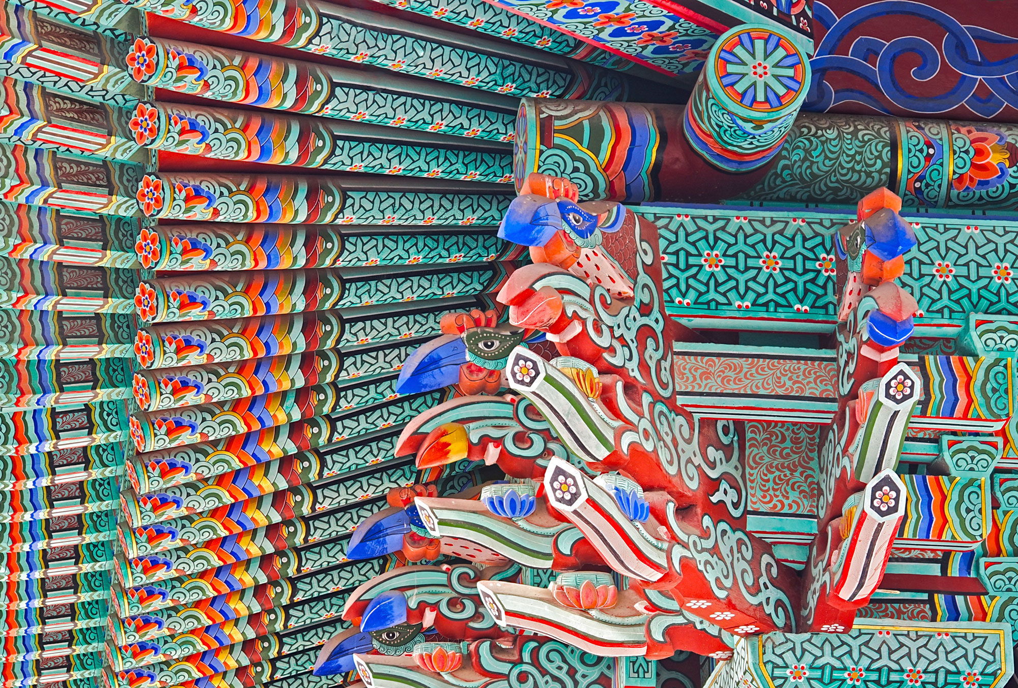 I thought about putting this in the Abstract category, but that would be presumptuous - 95% of the credit (or more) for this photo has to go to the makers of this beautifully decorated temple roof. To give some idea of scale, the cylindrical beam facing you would be about 1.5 feet in diameter, and it is 30 feet at least above the ground. The left half of the picture is running “north”, while the axis of the right half goes “east”. Decorations like this are found on nearly all temples in Korea.