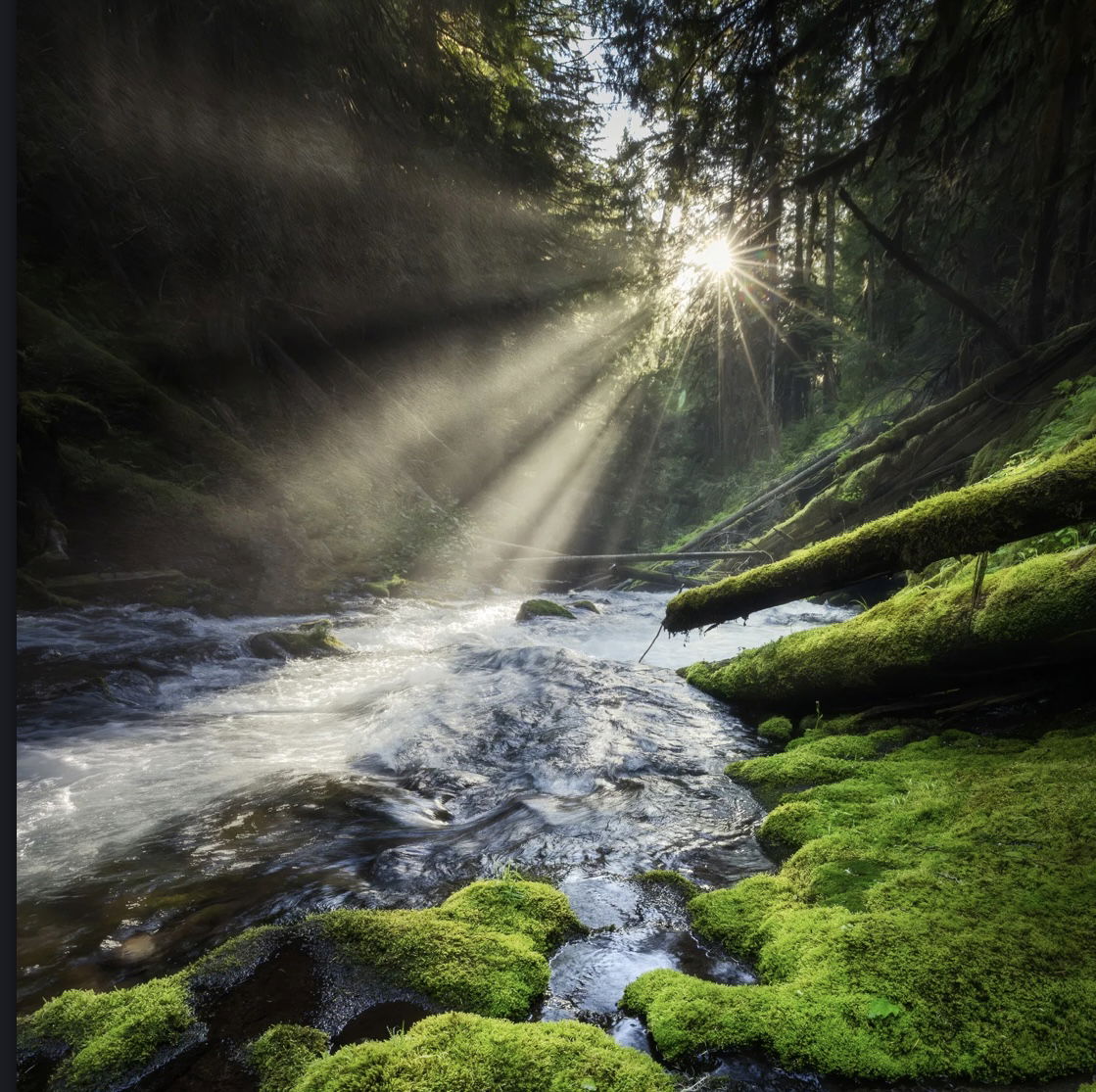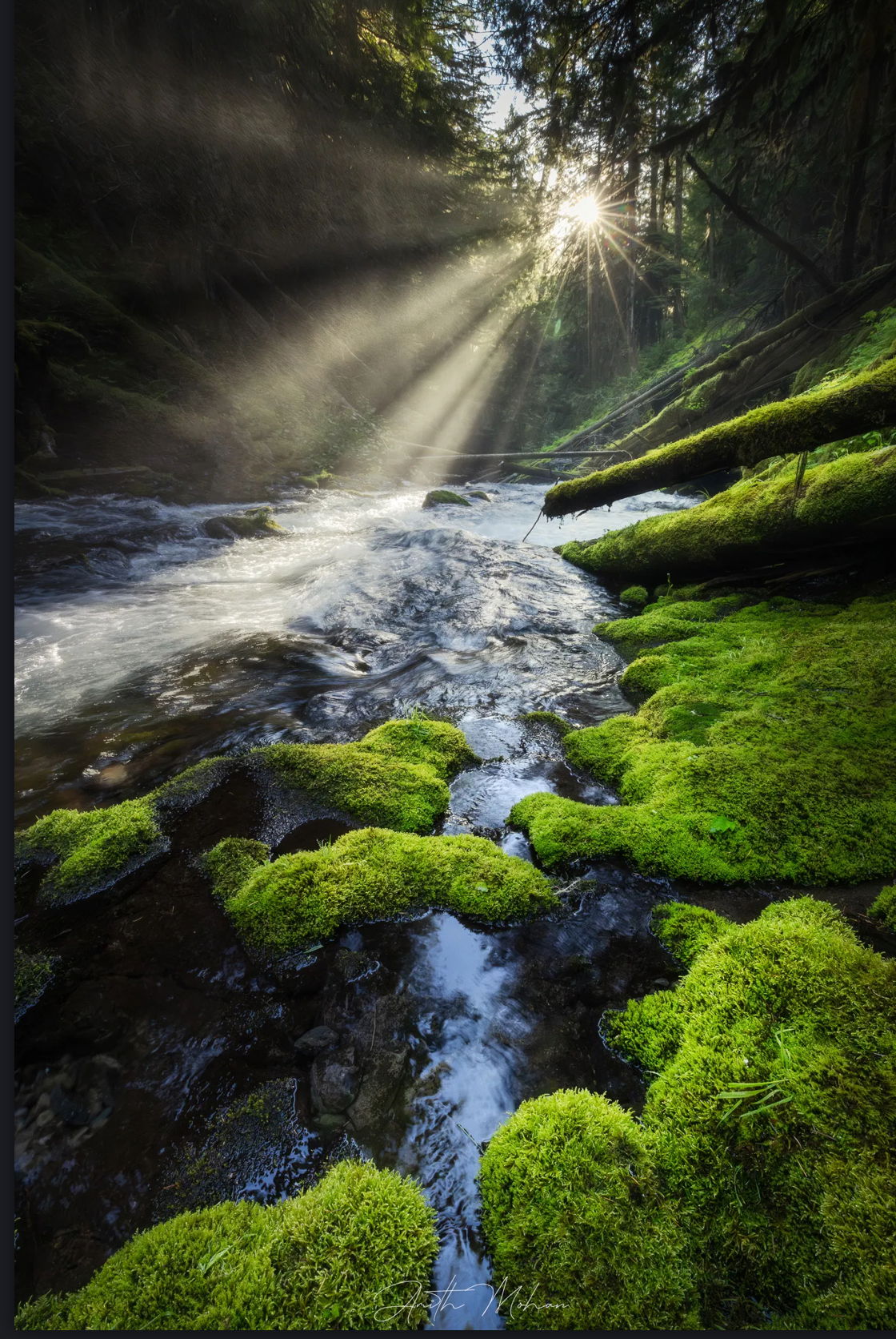 Witnessing this was a special moment. I was part of a small photography group and we hiked to deep into these woods on a mid-afternoon. Behind me was a beautiful waterfall. As the sunâs rays hit the mist from the waterfall it created this moment of rays alongside the beautiful mossy green. Of mosses, green and dampness. And fresh, crisp air.