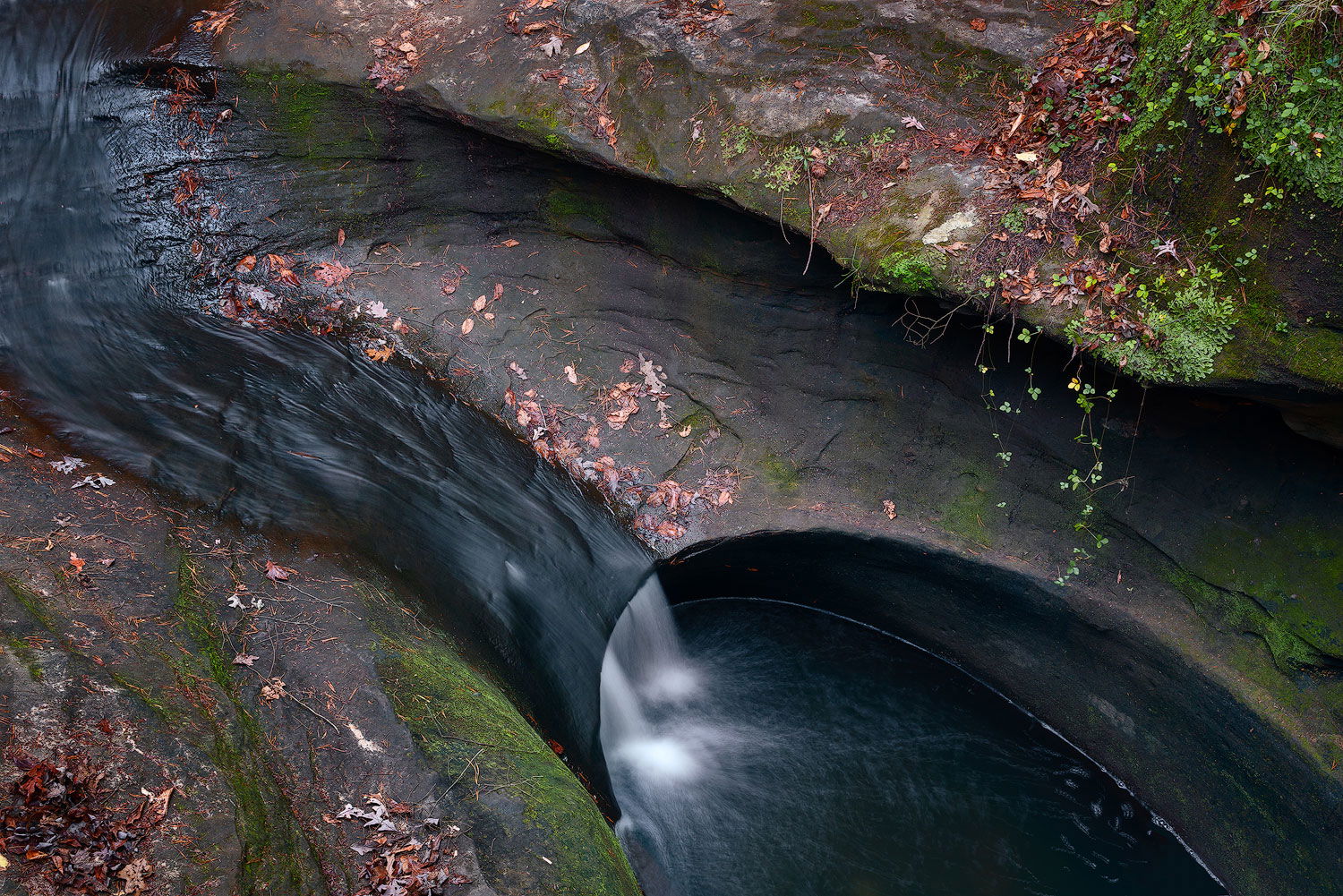 The power of water to sculpt rock is an amazing thing. This pothole looks like an east coast cousin to the slot canyons of the Southwest. The thing I like best about this image is the repetition of the curved lines in the rocks, both above and to the left of the main pothole. I also like where you cut off the pothole with the frame edge, it makes for a very dynamic oval shape. I think showing the entire pothole might not have been as interesting as the way you have it here.
