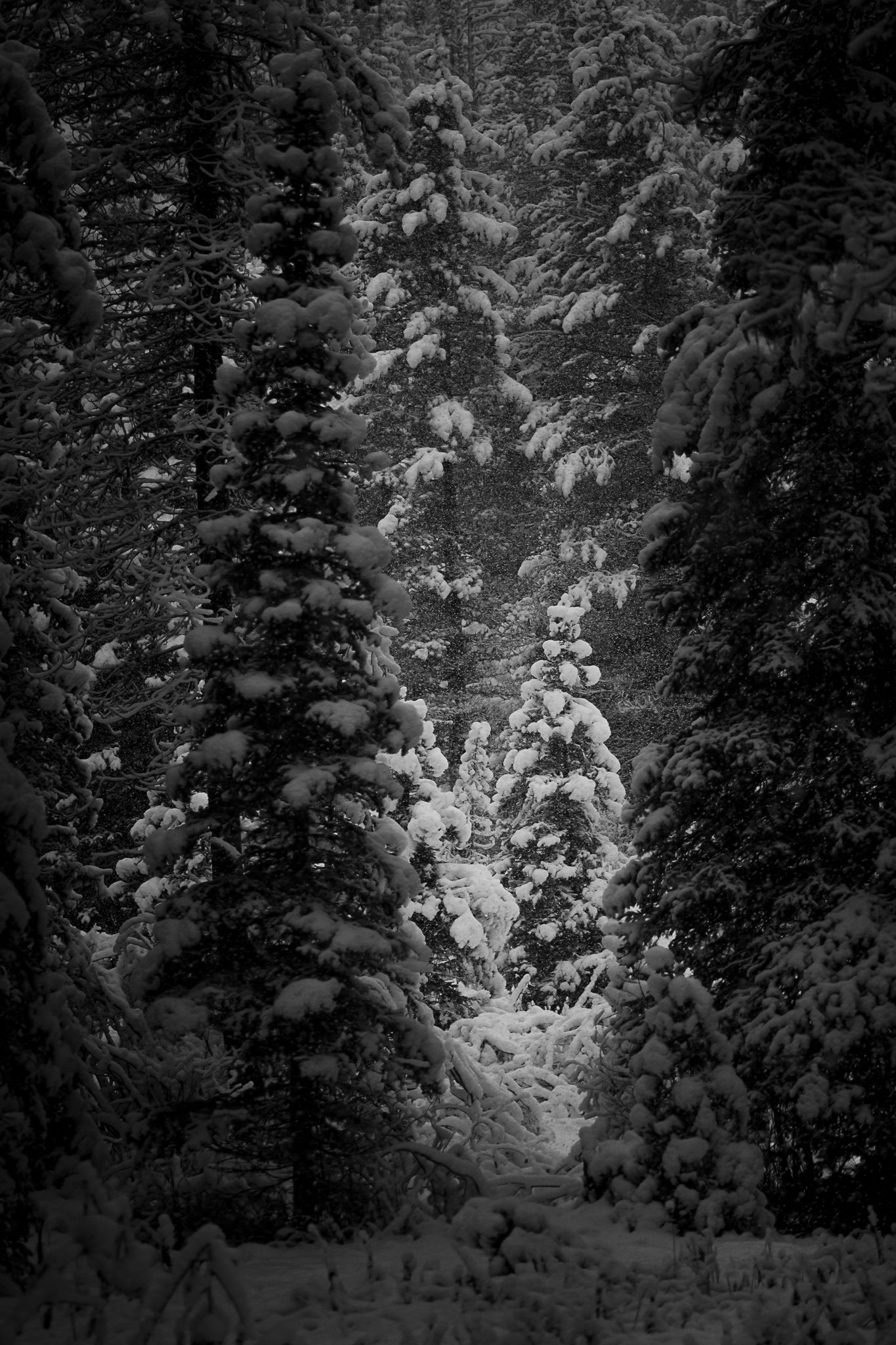 I almost drove by this scene while exploring the forest a few weeks ago. Well, actually I did drive by, but something in my peripheral vision said, “stop the truck and look off to your left.” By the time I got ‘er woah’d up, I had slid a bit past. I backed up and looked to my left. Yep, that light V shaped area with the inverted V repeated by several trees makes for a fairly compelling composition. Thankfully on a snowy morning like this, there was very little traffic on the road. I didn’t even get out of the truck for this one! The heavily falling snow adds some fun texture if you zoom in a little. This is a black and white conversion, but the color version doesn’t look much different! This is one the west side of a tall mountains and was just a few minutes after sunrise, so there wasn’t much light.