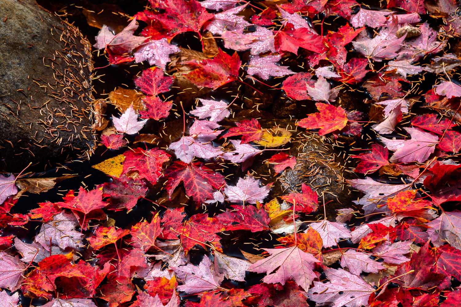 This scene is from a pool in a shallow river, which is why the rock is there. I think the image works either with or without the rock (there are actually 2 rocks). I thought it was less cliche with the rock included, But the leaf colors and patterns are strong enough that a pure abstract of the leaves works for me too. I have posted a rework above with the crop.