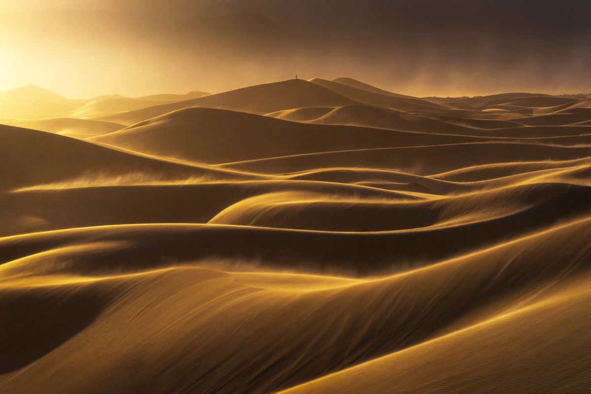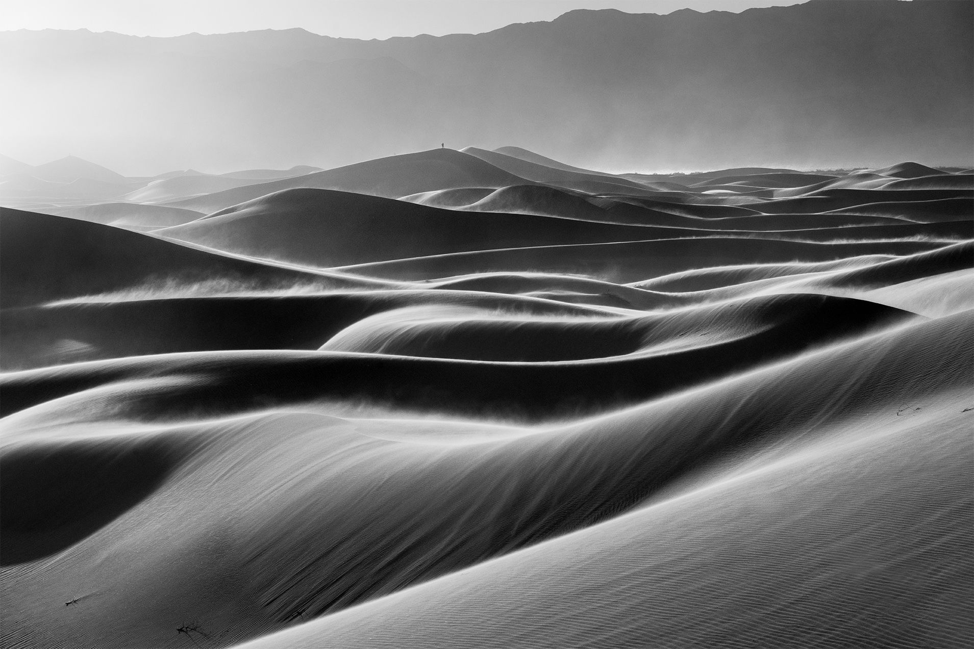 Markus, I love this image just as it is - all that golden light and the blowing backlit sand make this image a great story of wind in the desert and dunes of Death Valley. Of course, converting to black and white works as a different ‘take’ on the scene, but the color really suggests the time of day that the monochrome images does not do. I vote for it as it is!