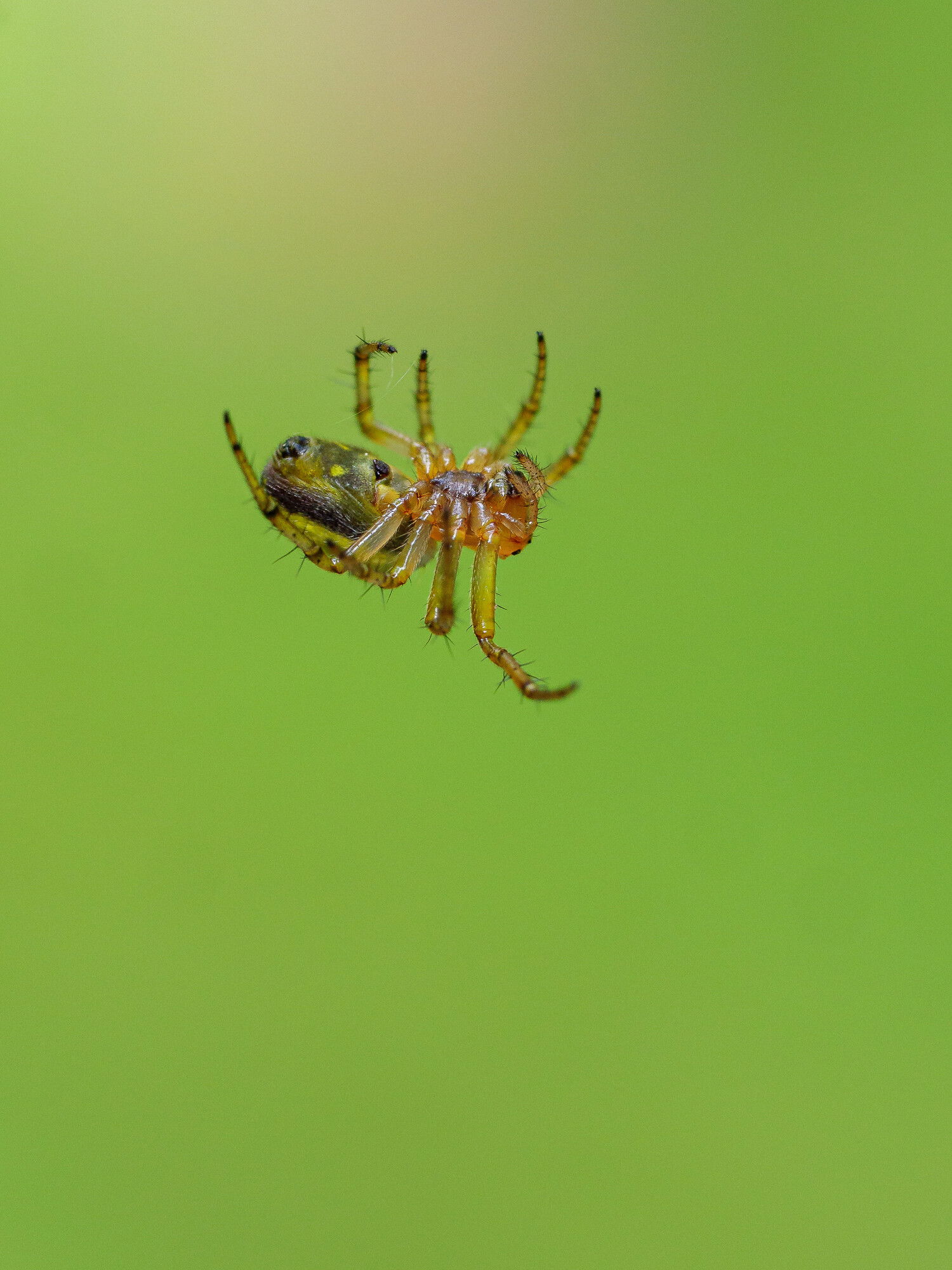 Very cool, with very nice DOF. We all know it’s suspended somehow and don’t need to see the evidence – it’s about the structure/morphology of the spider, and its acrobatic abilities. Well done!!