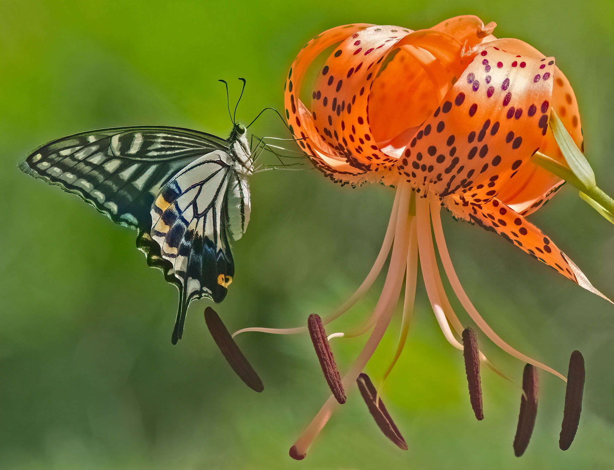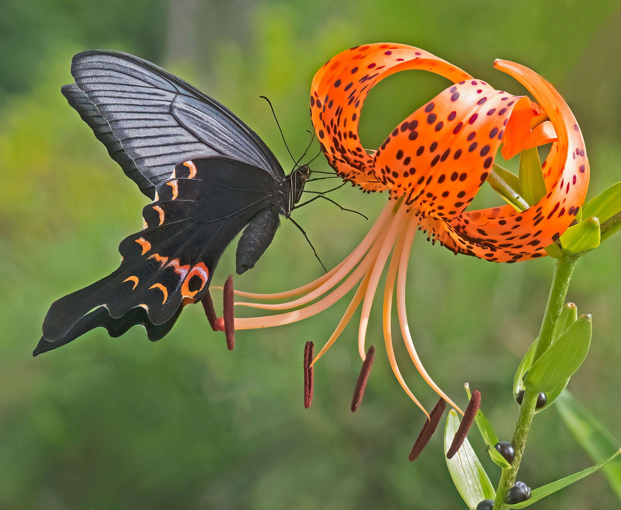 The Tiger Lily and Swallowtails are a pollination team. The nectar of the flower is located precisely so that the wings of the butterflies accumulate lots of that maroon pollen from the stamens to carry on to another flower. In 24 hours the flower will fade, but the pollen is dense, and a weaker, older butterfly will pick up plenty on its hindwings. The first one above is a Long-tailed Spangle (yesterday), the second a Xuthus Swallowtail (today, on a later bloom). I had to watch out for them, as they had plenty of zinnias to visit nearby, but at 8.30 in the morning, this was the flower of choice. (Note the bulbils, the small black bulbs in the first photo. They produce clones of the parent, but need 4 years to fully develop into plants)