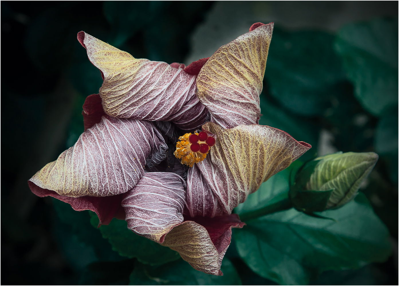 I love the unfurling look of this hibiscus too, Michael. Not sure that I have seen one in this position before, but enjoying the colors and textures of it. I like what you did with the black background, but really, I like the original as well. Not sure if it is the bud that is selling me, even though it is out of focus, or just that I like the greens around it in nature. Both are very good. Maybe on the original yo could vignette around the edges to draw the eye more to the subject. Excellent capture, and post processing.
