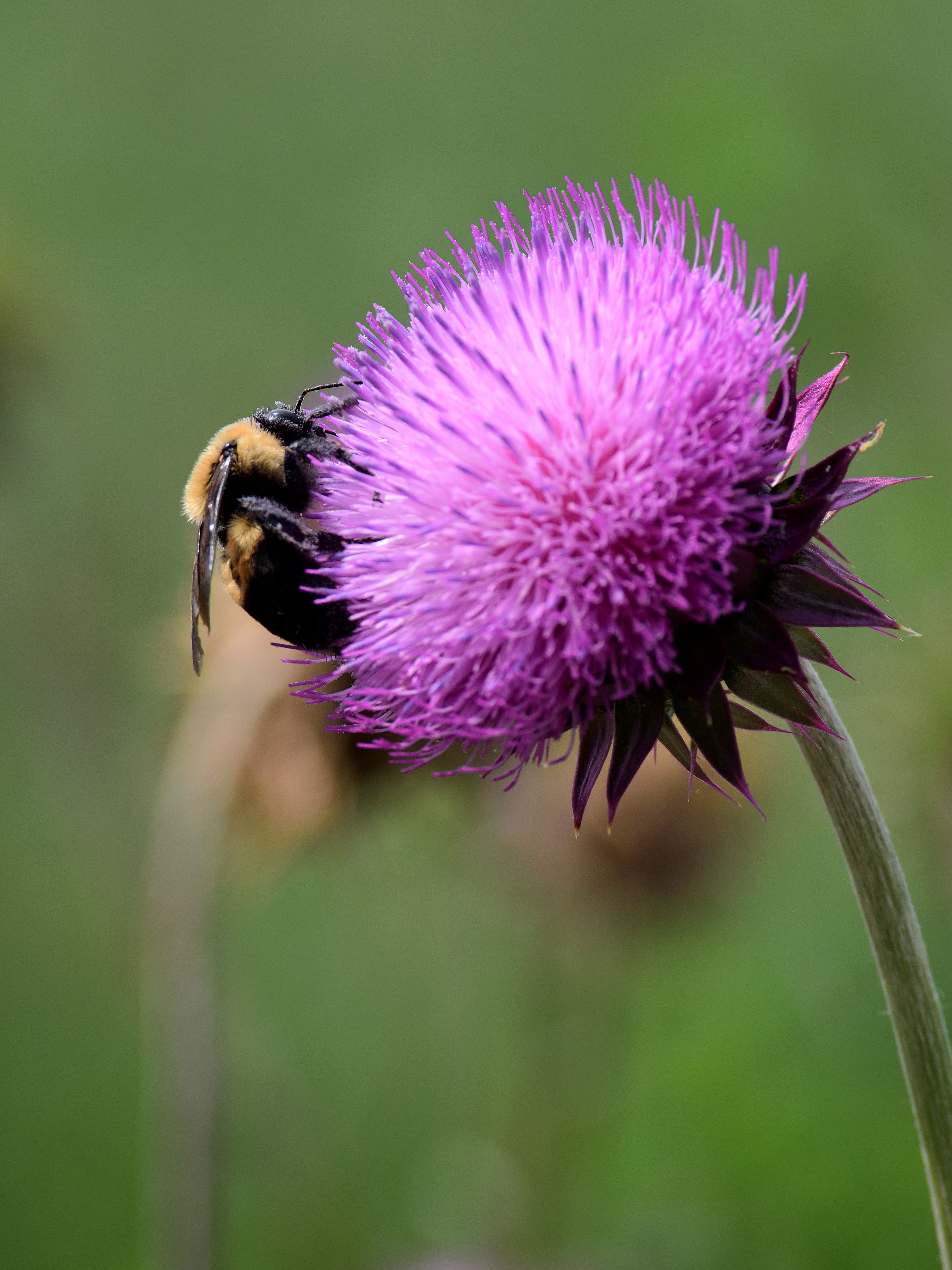 Hi Nicholas, welcome to NPN. This is a great first post, with fine colors and details in both the bee and the thistle. The background is nicely soft and the greens add nicely to the sense of summer. One way to improve on this would be to change your angle of view so that the two oof seed heads are not connected to the subject. That would increase your options for adjusting the brightness/darkness of those, which can change how much attention they draw.