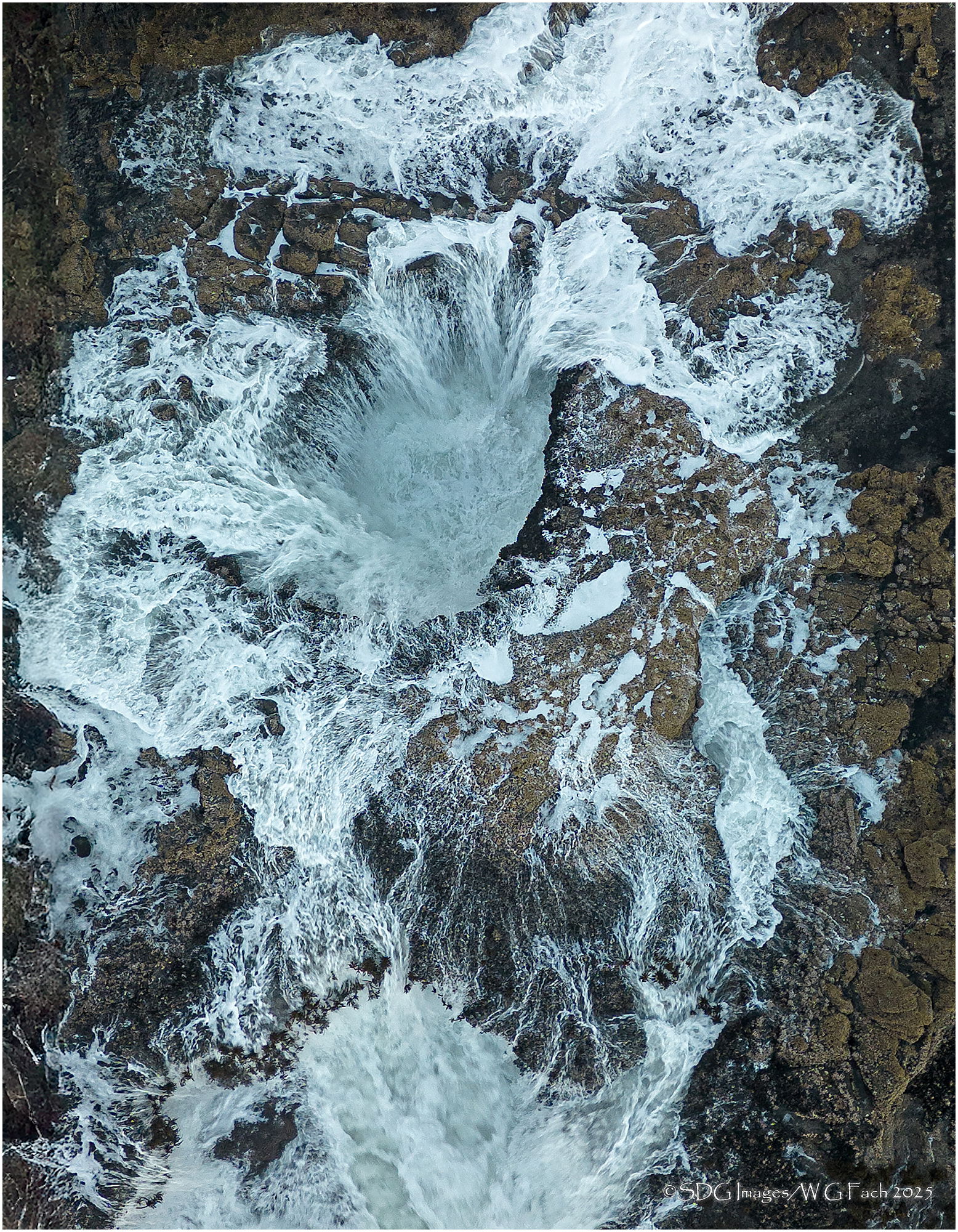 I grew up in Indiana but one of my grandmothers lived in Yachats, Oregon. From the time I was a little boy until now I go back to the coast as often as I can. One of the coastal features just south of Yachats in the Cape Perpetua Scenic Area is Thor’s Well. I have many images of the well taken from the observation deck and from down on the rocks themselves but I was never fully satisfied. On my trip in October 2023 I went there for the first time with a drone and spent the better part of a morning flying and shooting. The wave action was thoroughly compelling and mesmerizing as I watched the well fill and drain. This is my favorite directly overhead shot as the well drained. >=))>
