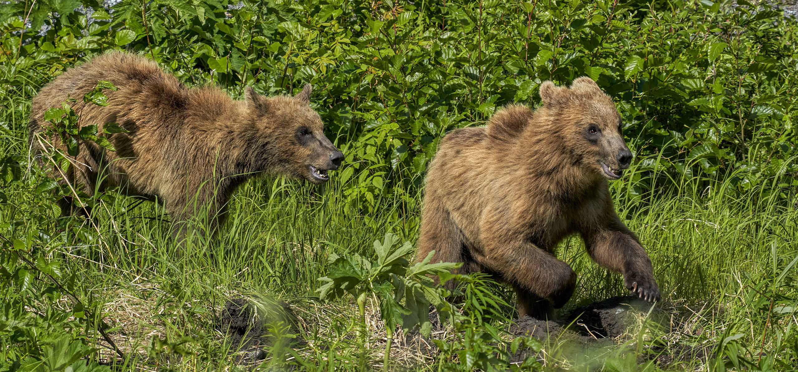 A pair of Brown Bear cubs that were having a blast chasing each other and rough housing while Mom was digging holes for voles. Note that there are a couple cub size vole holes in this photo