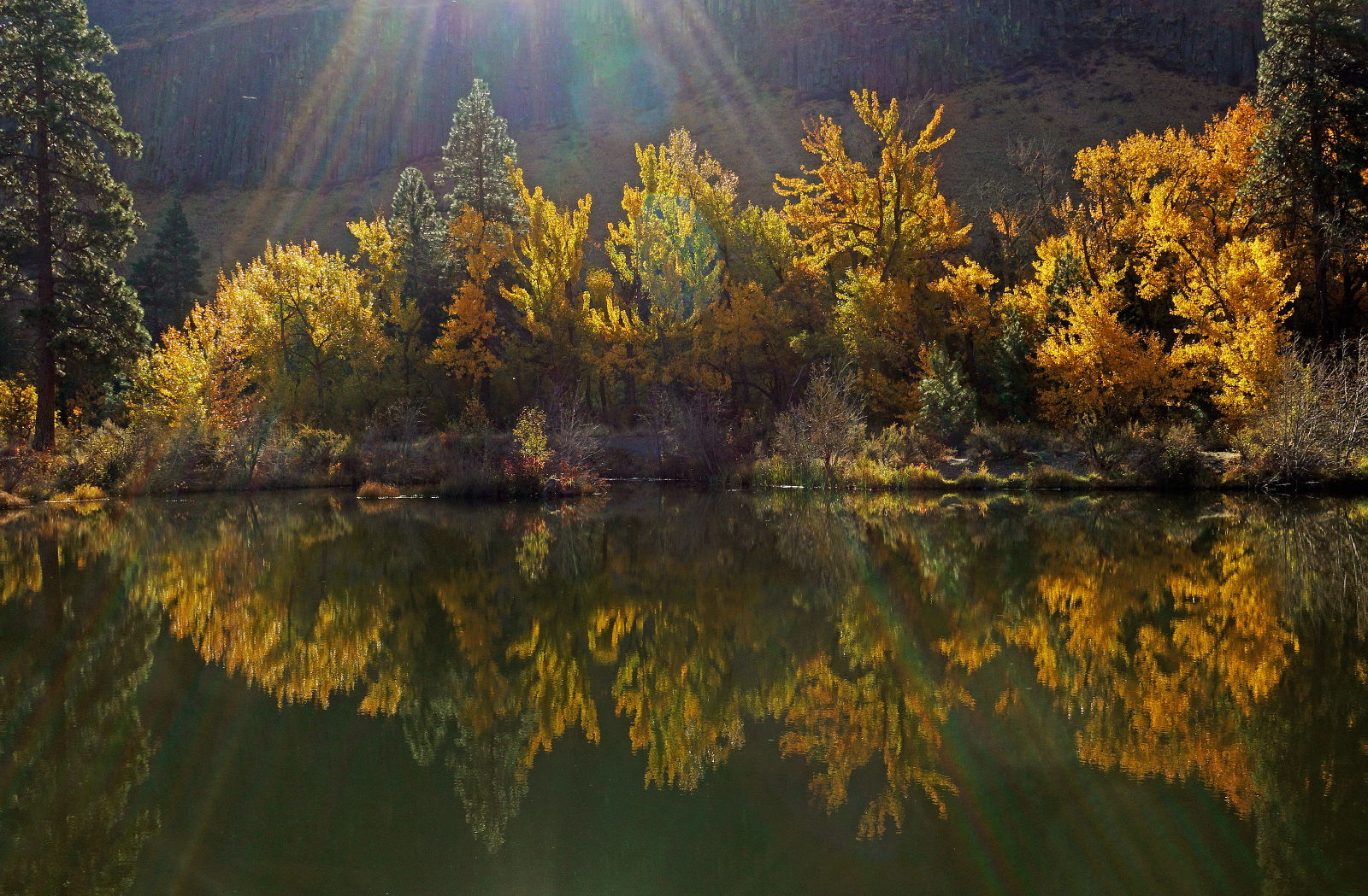 This is beautiful, Jim. The glowing trees and their reflections look great. The flair is a fine addition that speaks well of strong sunshine on a beautiful day.