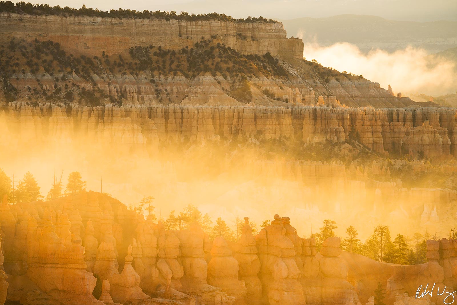 Overall the image has a feeling of being too warm. Especially in the shadows. As a result you are losing a bit contrast between the warm fog and hoodoos and the upper cliffs. I would suggest starting at more neutral WB and then add some WB adjustments locally. You could even try using the split toning in LR. Blues for the shadows - you’ll pick up the greys in the rocks a bit more and oranges yellows for the highlights. I think that should make the shot a bit more dynamic and also intruduce some depth.