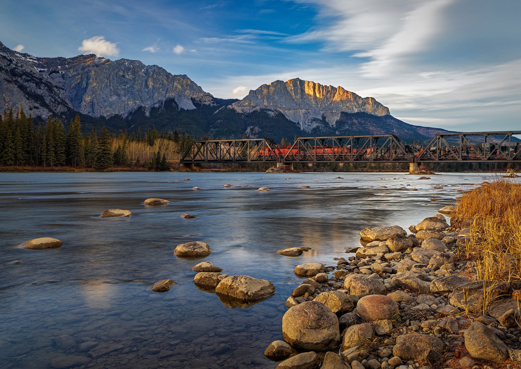 Tom: Do you mind disclosing this location? As an avowed train lover since infancy this automatically ranks high on my list. The light on the mountain looks pretty darn good to me and your processing of the clouds looks spot on. Were these locomotives running light? I assume this is CP although if so the color on the engines doesn’t quite jive with what I remember. Looks more like BNSF. Having the locomotives on the bridge makes this much more interesting to me than if the bridge was empty. Good timing, great result..>=))>
