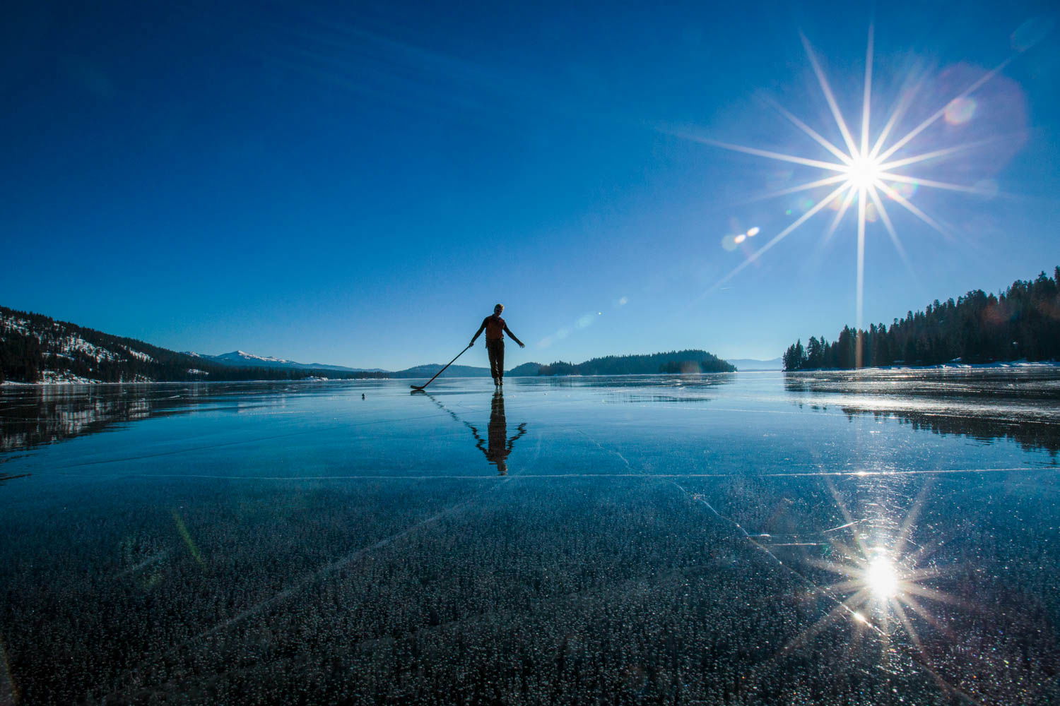 Black ice on our local lake doesn’t happen every year due to snowfall timing. So when it does, it’s a community event, with half the town showing up to play: figure skaters, hockey players, long range skaters, random recreational skating, ice fishing, etc. Then there’s me on my Norwegian kick sled photographing them all, not to mention the incredible otherworldly ice formations. This was a rare take on a single hockey player, with puck & stick visible, approaching me backlit in the sun. I got down low to make sure all the reflections were a part of it.