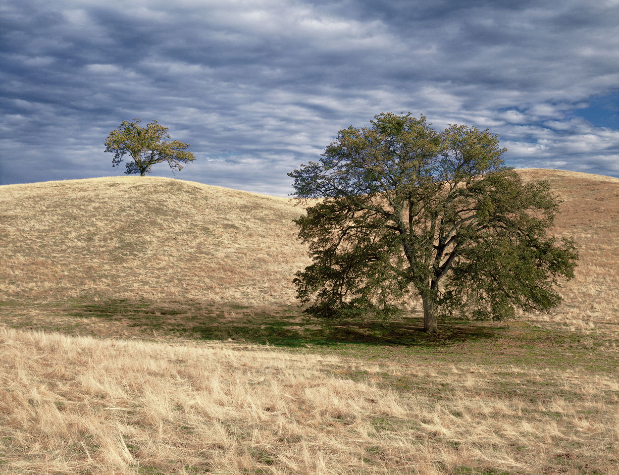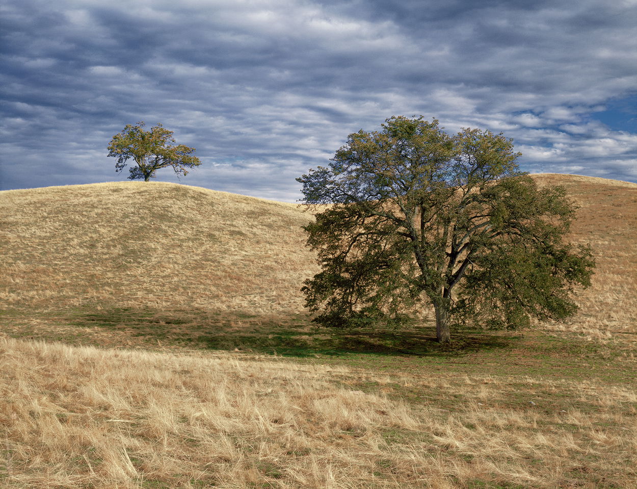 What drew me to make this photograph was the repeating shapes of the hills and the two trees. I was fortunate to have great light, nice textures in the grasses, and that wonderful sky.