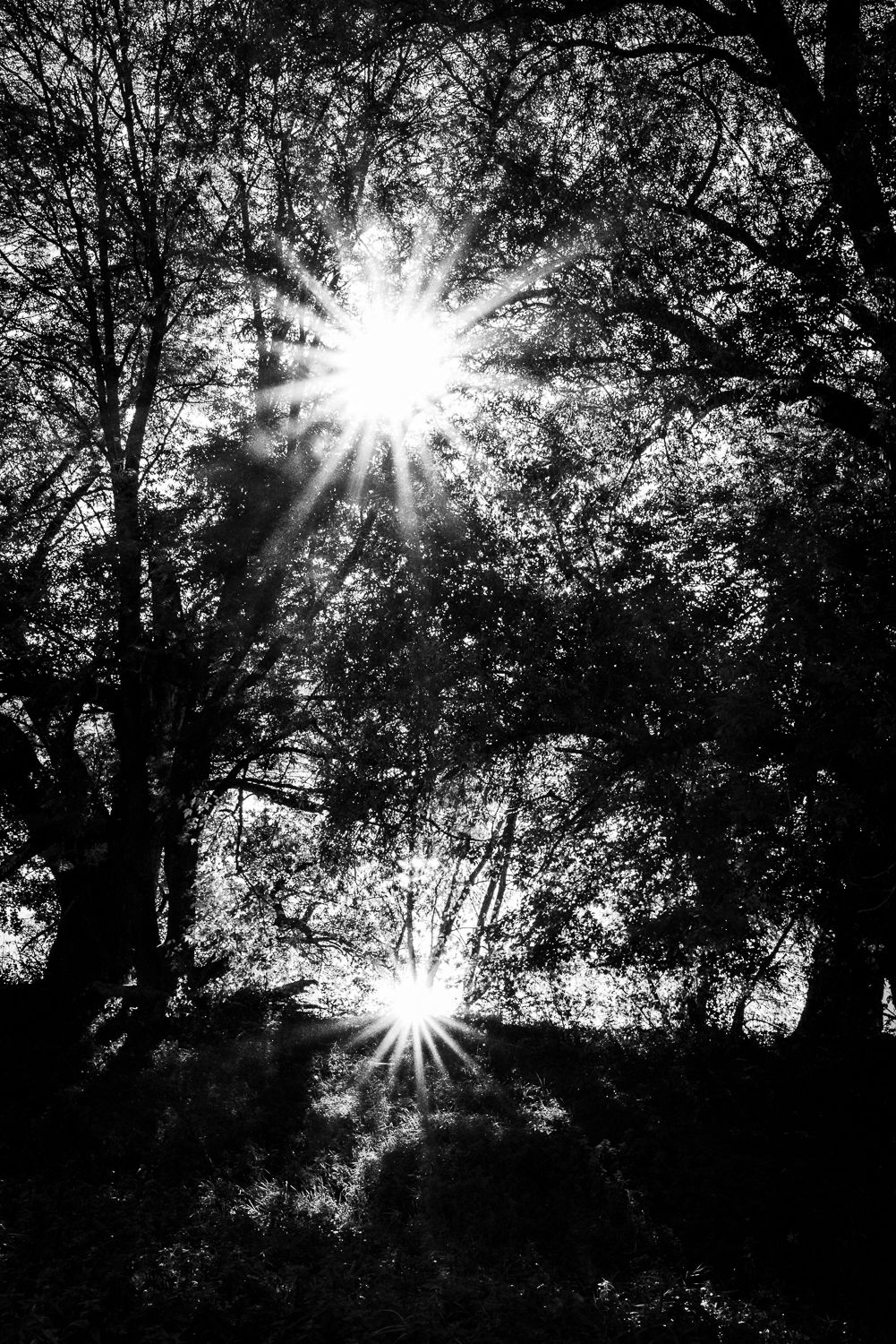 I took the shot in the afternoon, walking close to a river. The reflection of the sun in the water looks like a 2nd sun. I wanted sun bursts, so I stopped the lens down. When I took the shot, there was just light and dark, so I kept it in the picture, i.e. almost no mid tones (what I like anyway in B/W).