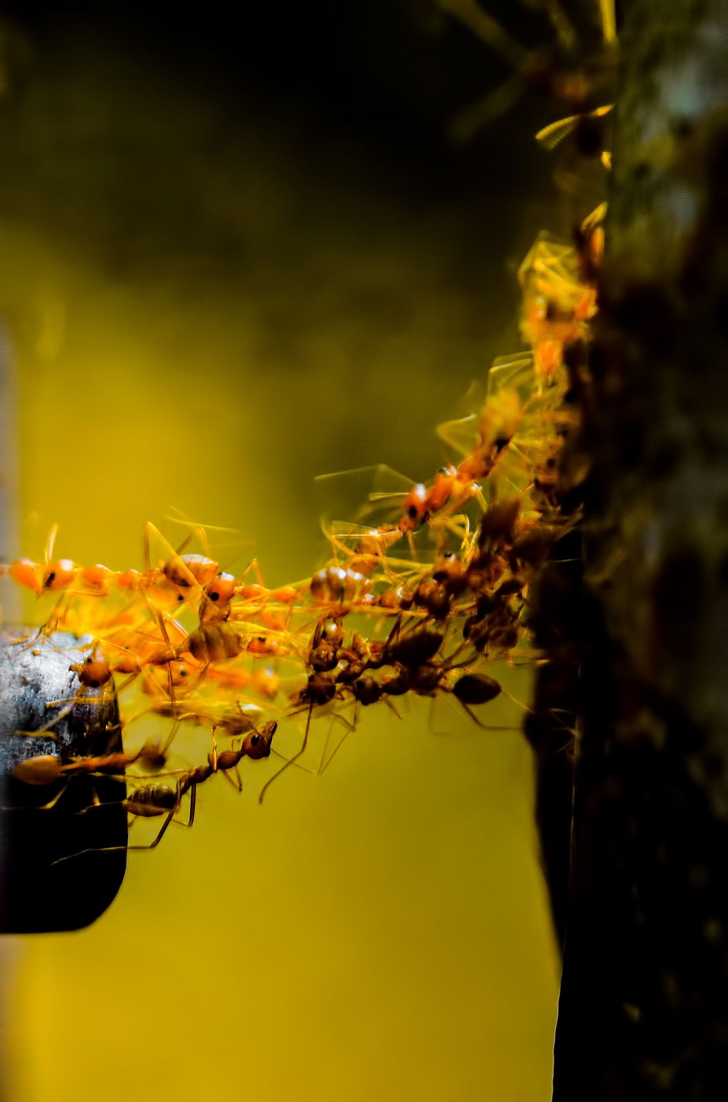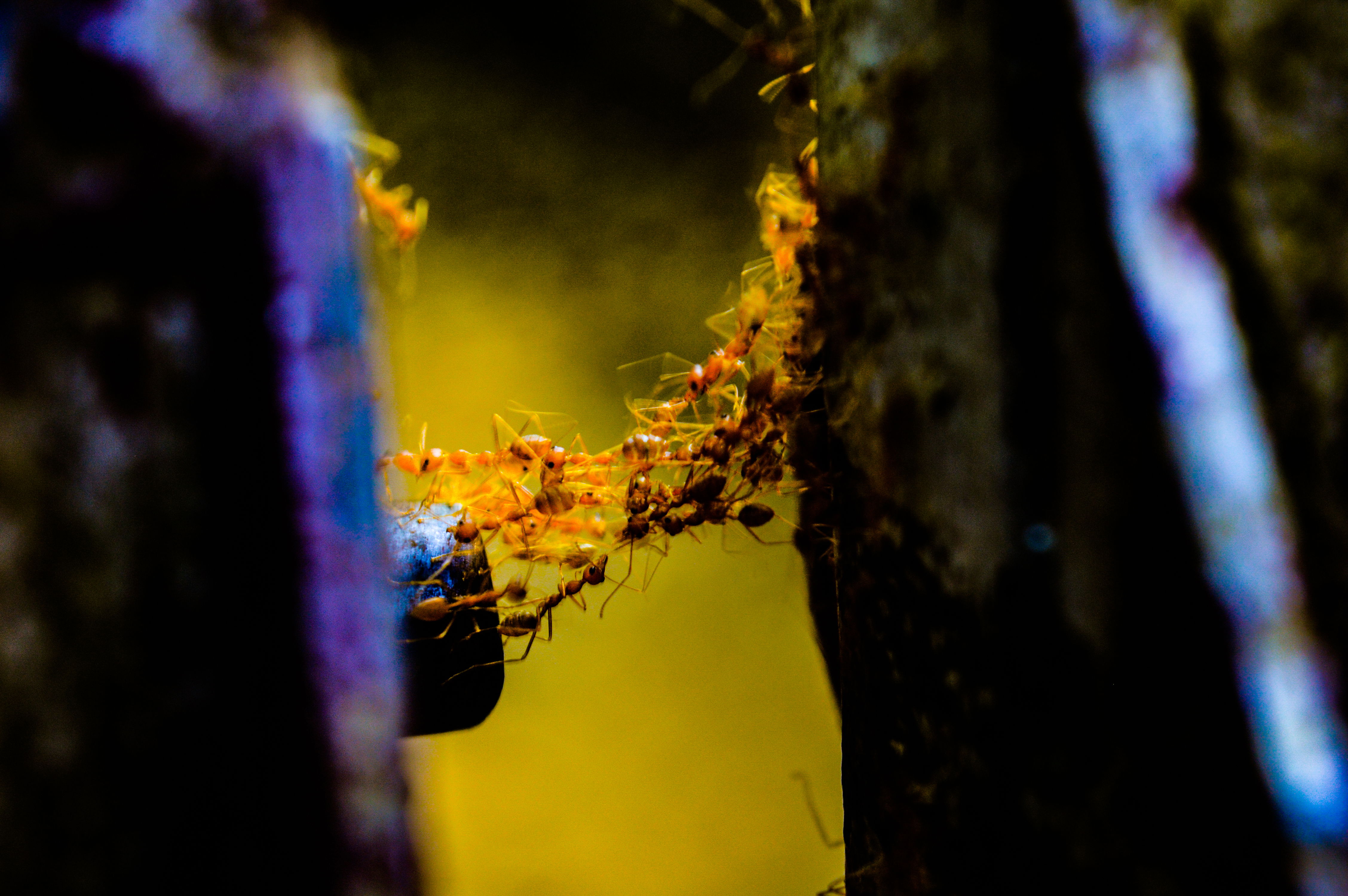 Nishand, this is a good look at the ant bridge. The slow shutter is nice because it blurs the moving ants, which helps describe what the group is doing. Getting in closer, so that the bright parts along the edges aren’t seen or could be cropped out would be a nice improvement.