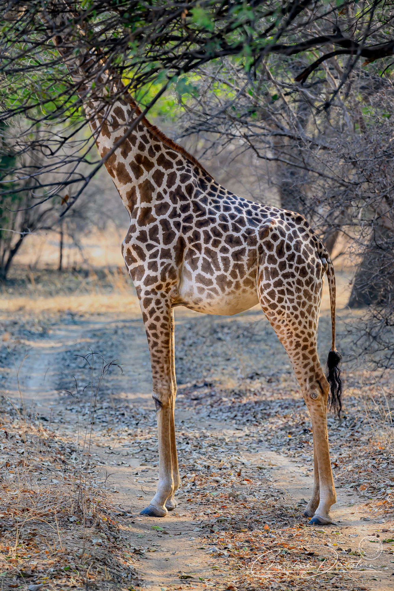 Was sort of mesmerized by this Giraffe in the road while on safari in Zambia this past September. Its head was obscured by the tree canopy, but I kind of liked just the body shot. Unmistakenably a giraffe, right?