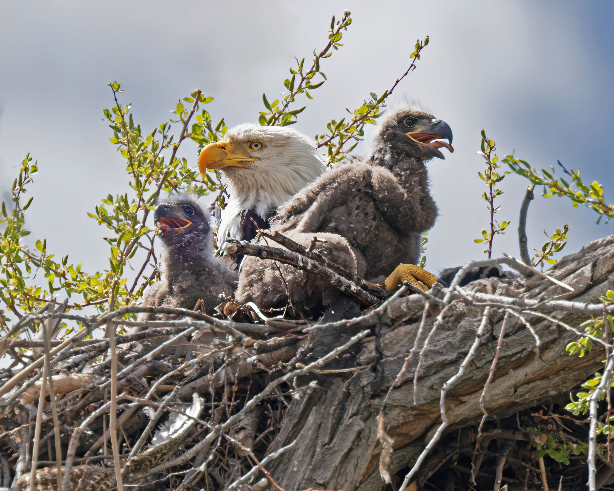 You’ve got great focus on all the birds Barbara. The fuzzy chicks are wonderful. I like the green foliage breaking up the sky, and subtley framing the birds.