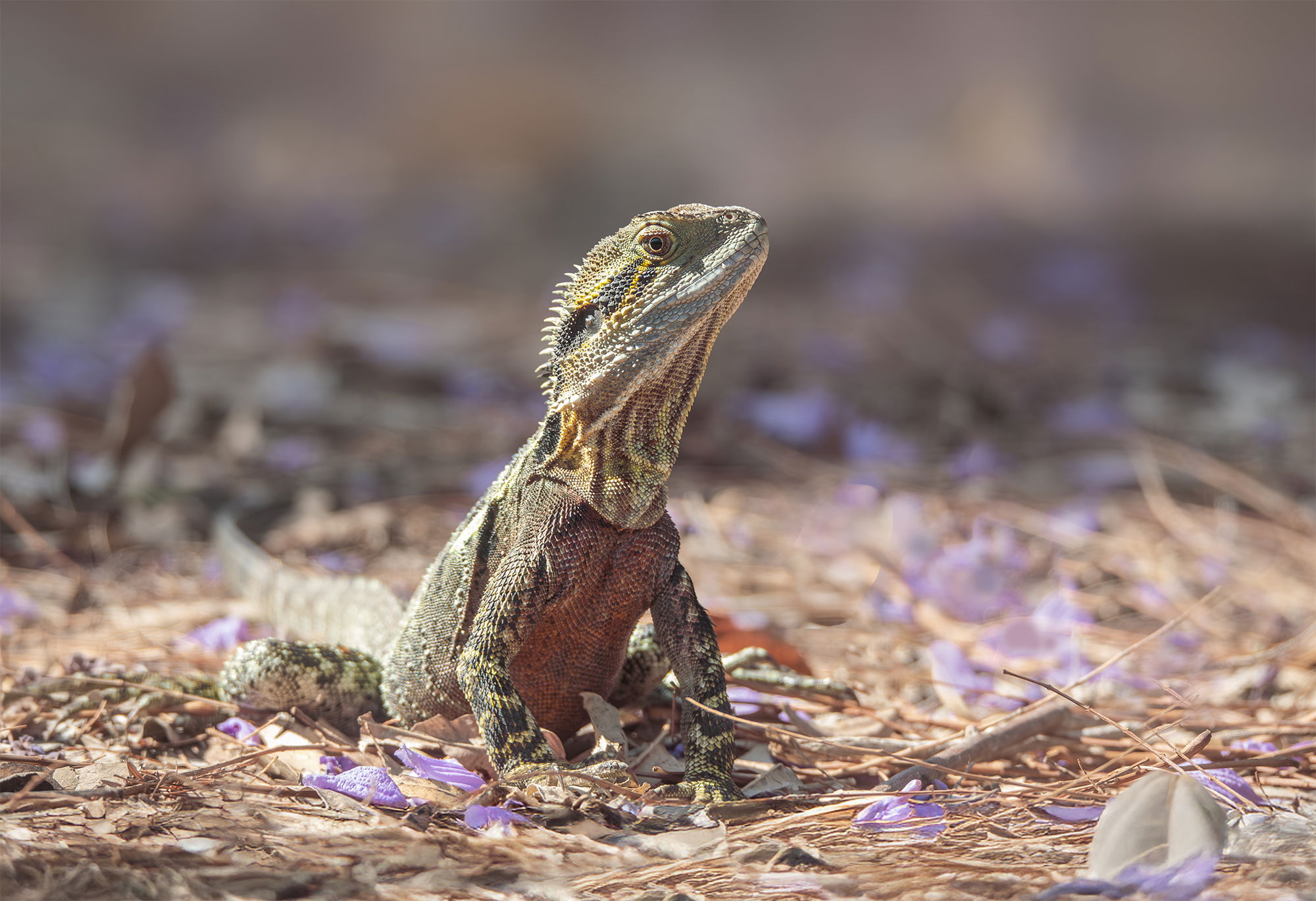 Water dragons are fairly common, anywhere near water, where I live. They are robust, not-so-timid subjects. We were supposed to be shooting flying fox when this little fellow came out to check us over. Being surrounded by pretty fallen flowers is an unusual setting for a water dragon.
