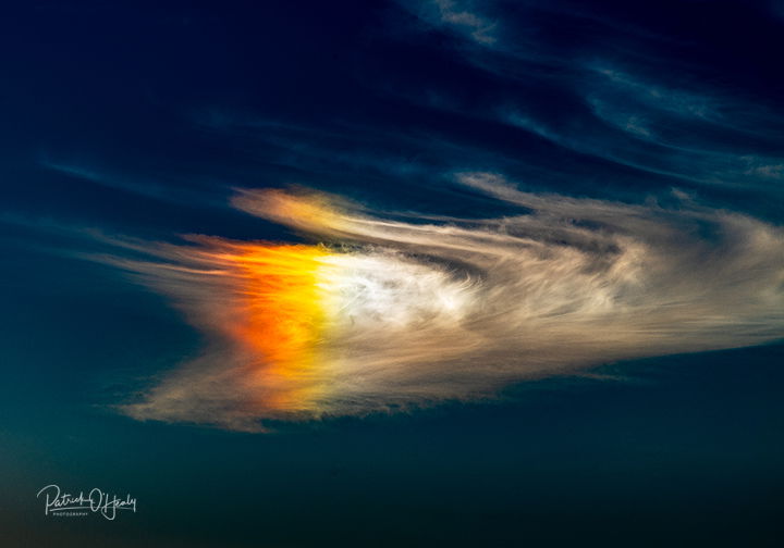 Patrick, this could be cloud iridescence or a sun dog. Given the brightness, shape and color, I think it’s a sun dog. (The sun would be at the same height, but off to the right.) There’s a great “atmospheric optics” site here that describes and shows images of the wide variety of optical phenomena that can appear in the sky. This view is quite colorful, but not realistic, especially in how dark the blue sky is.