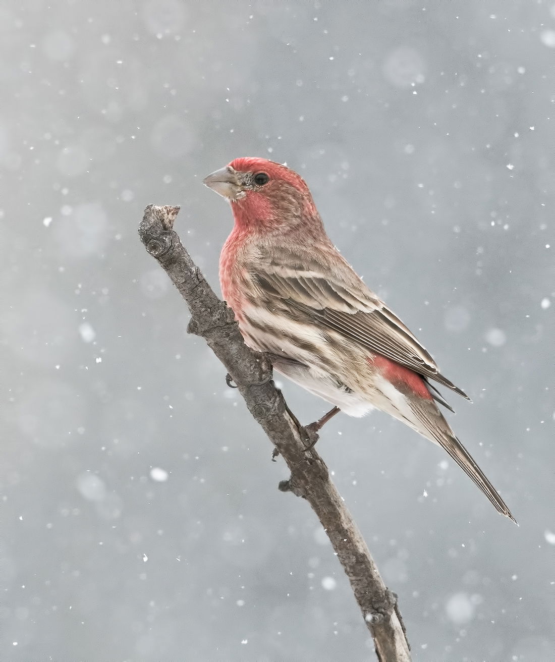 Nice look at this house finch in the snow. Particularly good job of snowflake distribution and depth of field here. Gives a really nice sense of time and place. Excellent exposure. I love the diagonal perch.