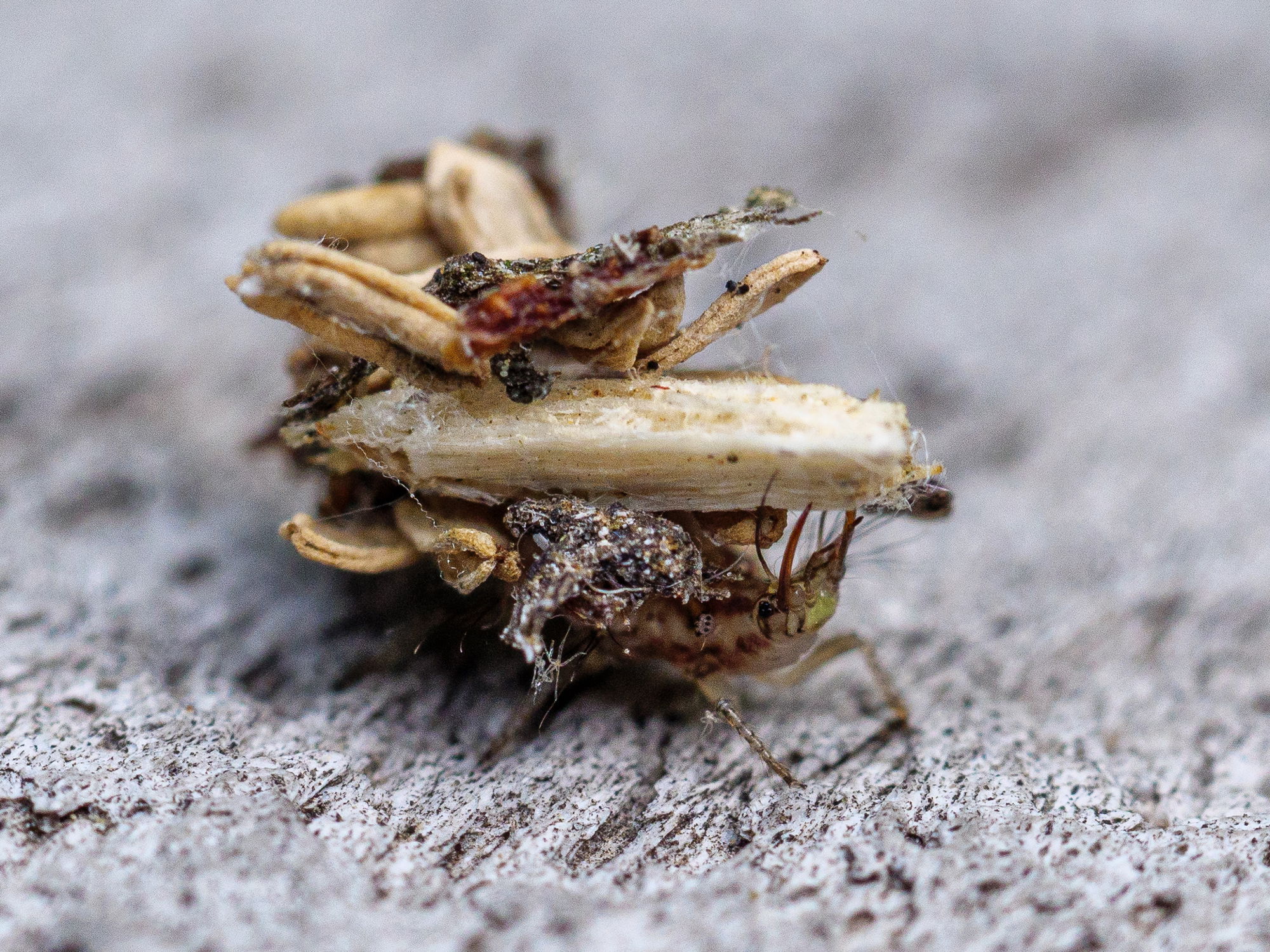I noticed this little bit of crud moving against the wind on the deck railing so investigated. Never saw anything like it. IRL the whole little bit of stuff is 1/4 inch or less. Gardeners use lacewing nymphs as pest control so they can be beneficial. They gather and stick debris to themselves as camouflage. This is a series of photos of the bug picking up and moving what looks like a tiny seed onto its back with the rest of its crud.