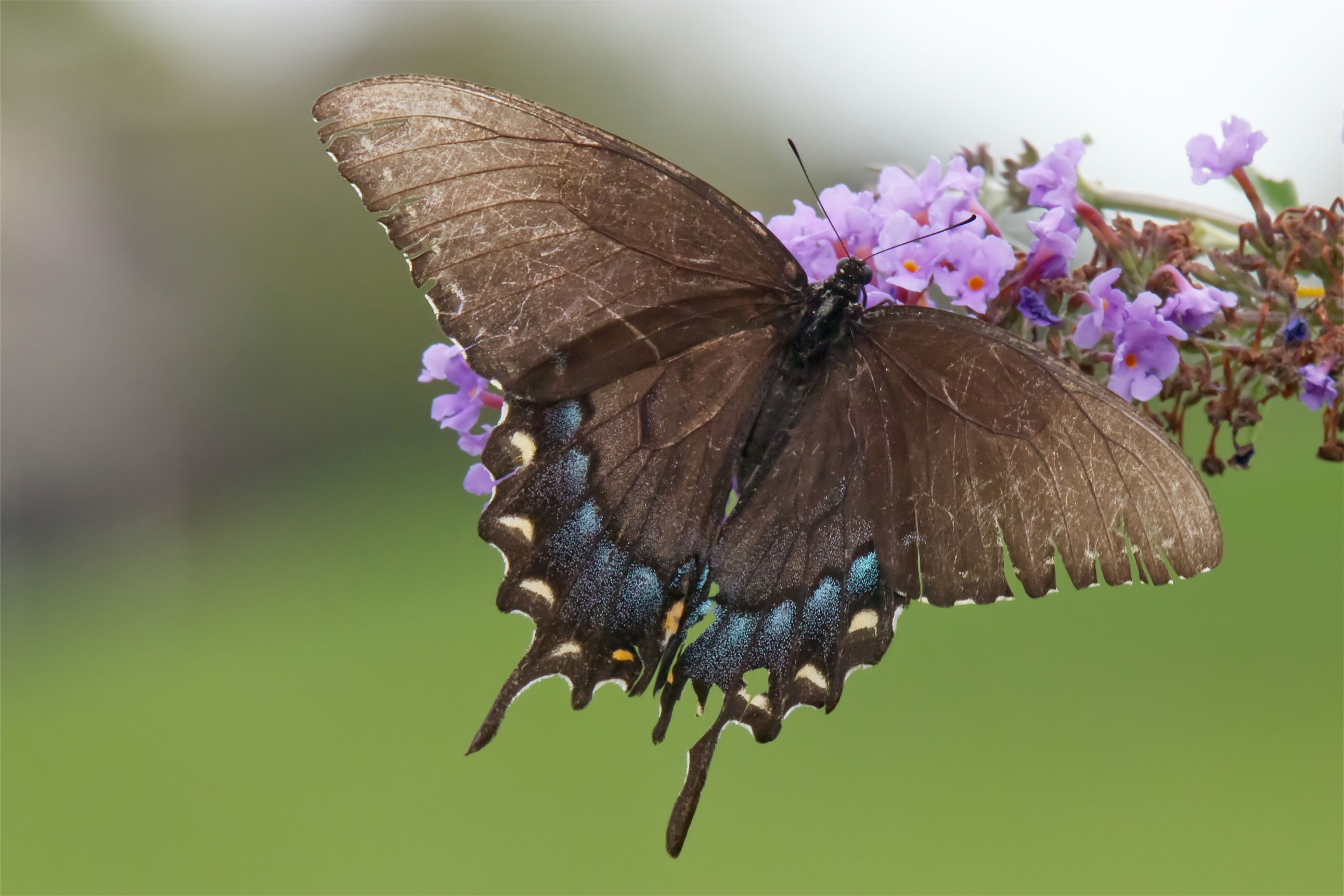 We grow flowers, milkweed and a butterfly bush in our backyard to attract butterflies - the image of the black swallow tail with a ragged right wing was taken in September