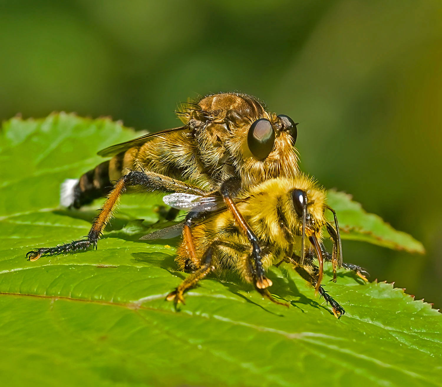 This Korean robber fly has its dagger firmly in the back of a hapless bee.