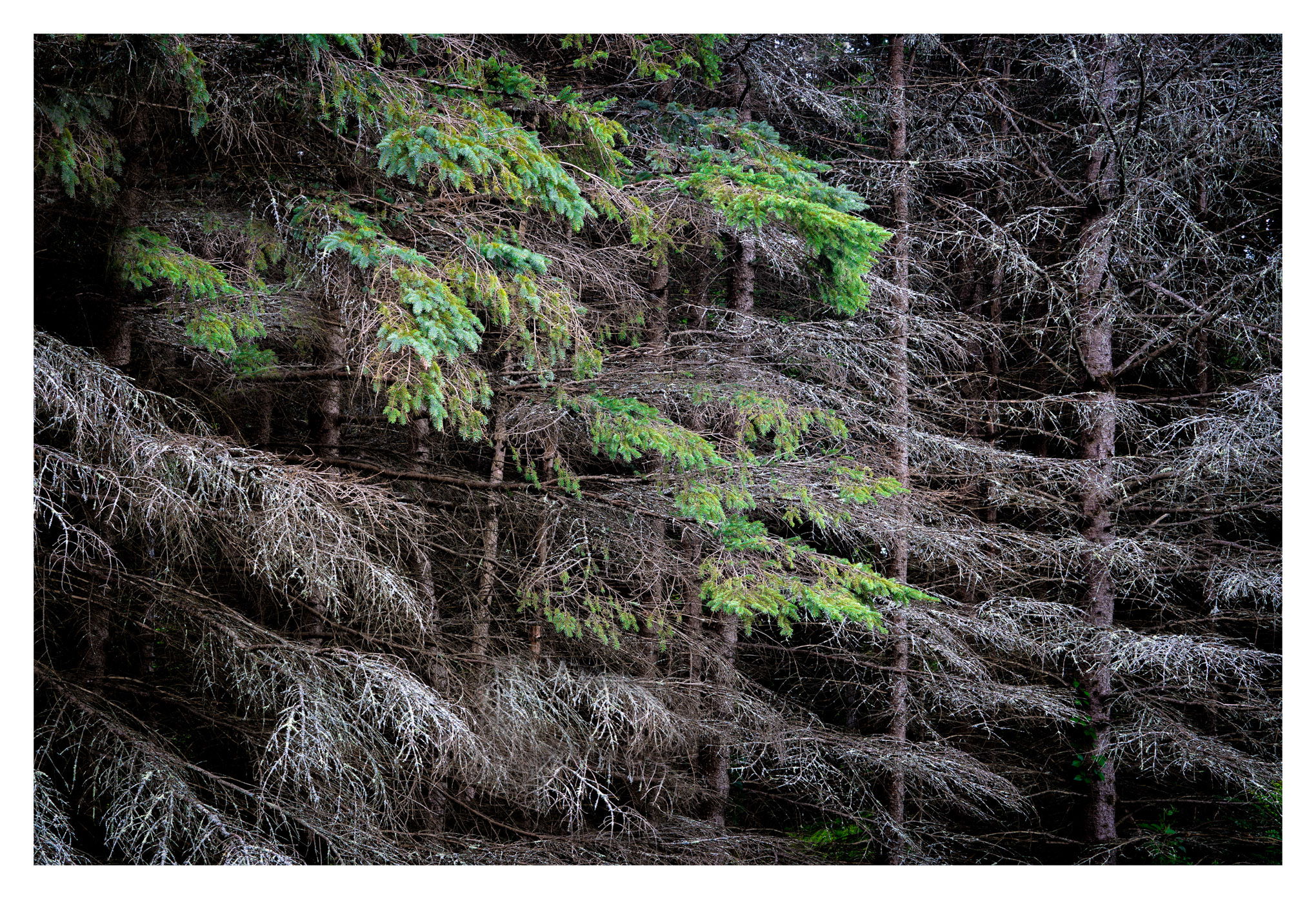 I like the composition here. The living branches are nicely isolated and rise above the rest. If the bottom section permits the same isolation, you could extend it downward. The color looks a bit cool to my eye, but I wasn’t there. I mean the shading from the new needles to the older ones - new needles are generally a warmer, more yellow shade of green and these do the opposite. I think sliding the wb to a warmer temperature could fix this and the slight magenta cast I see in the dead tree trunks. Tangly, jangly goodness though. Quite an interesting place and I’m up for more shots from here.