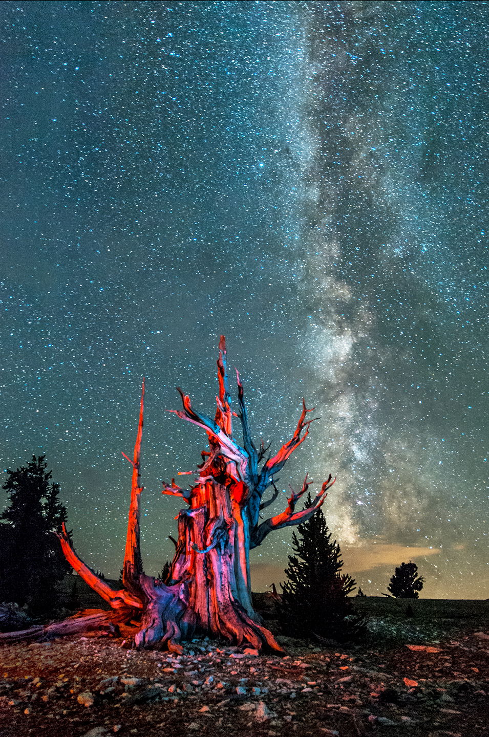 30s at f/2.8, ISO 3200 @ 18mm during the dark of the moon in mid-August. Light painting on the tree with one side a red light and other side with white to allow for creating the contrast in the rugged tree textures.