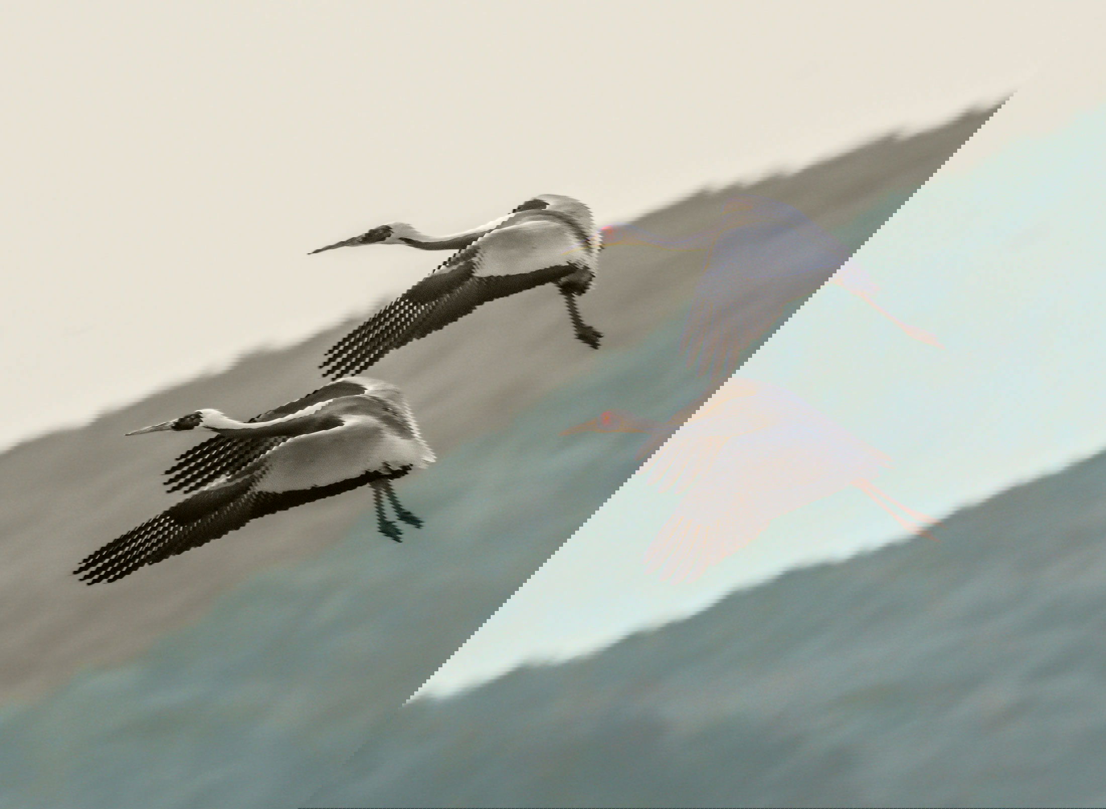 Sounds like these beauties are in the same boat as whooping cranes here in the Americas. Congratulations on being able to see them and bring back photos like this. The graphic quality of both the birds and the background makes for a very striking image. You caught the wings perfectly, too - they are almost synchronized. Overall it’s a little soft and they eyes look odd under a lot of magnification, but who cares, really. It’s such an uplifting shot even though they’re descending. Maybe this year when my photo blind arrives I’ll get down to a big refuge in the southern part of Wisconsin where the whoopers come back to breed. If I’m lucky I’ll come away with an image almost as pleasing.